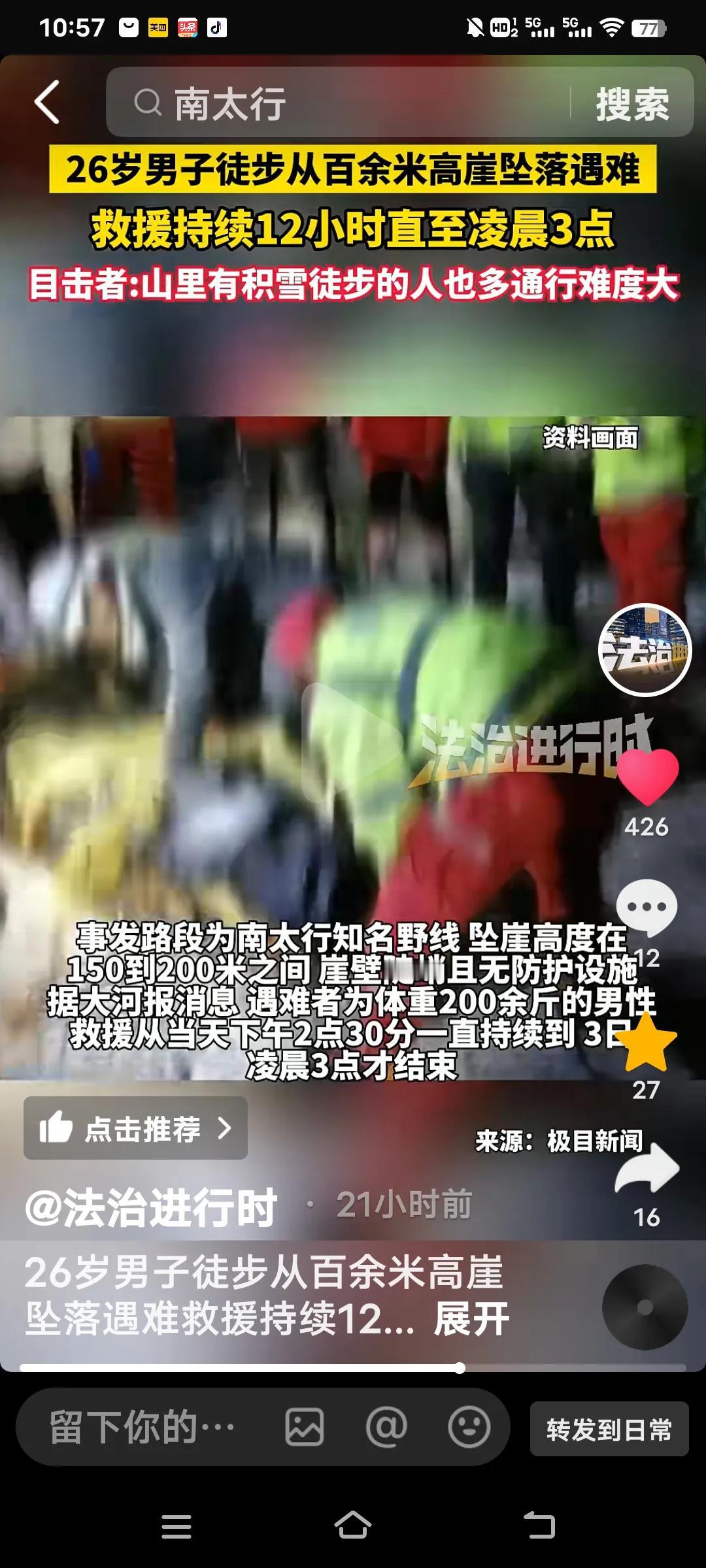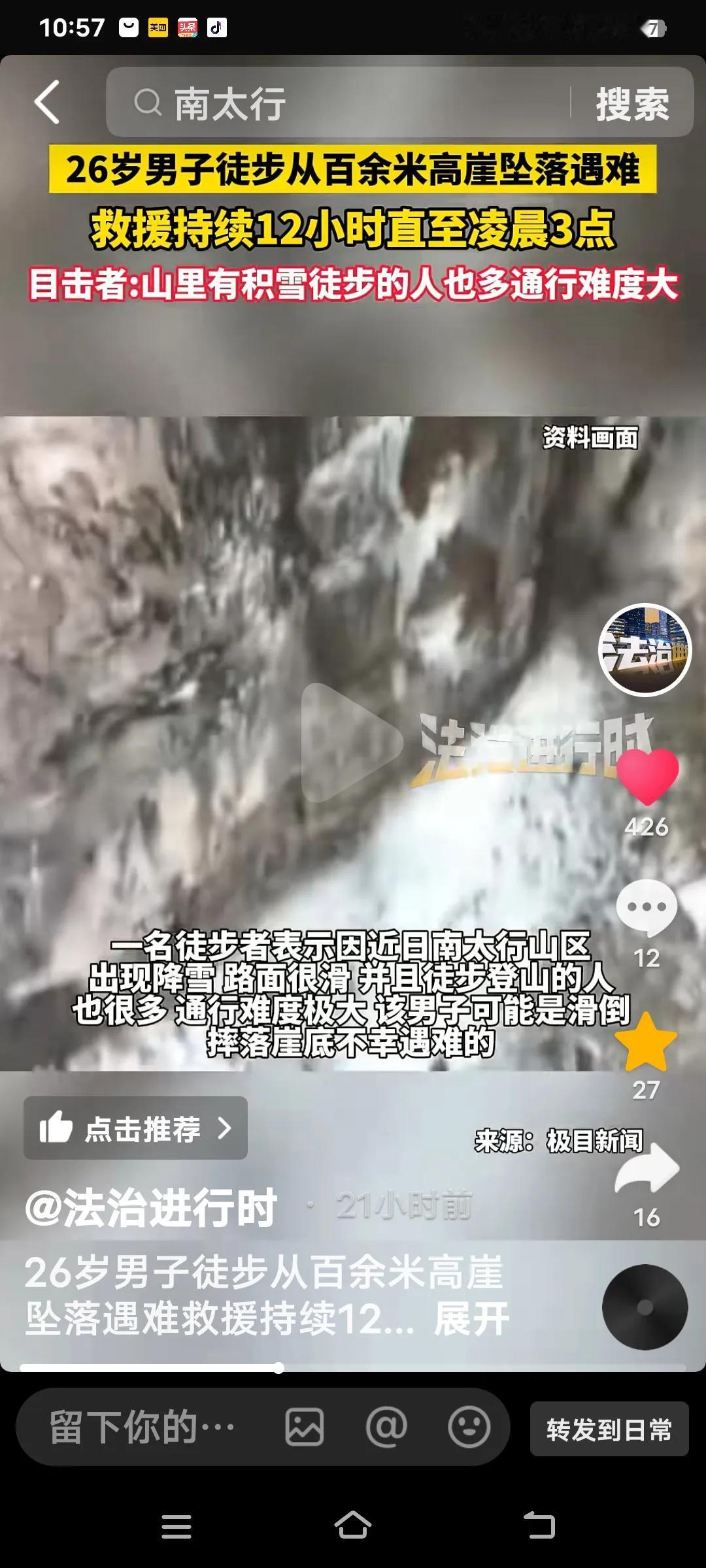 1月2日下午2点30分,南太行抱犊至西莲的野线发生了一起悲剧。一名1999年出生、年仅26岁的山东男子,与两位朋友一同前来徒步。由于近日降雪,路面湿滑,他不慎从150 - 200米的高崖坠落,头部遭受重创,当场遇难。 事发时,现场一片混乱,众人赶忙报警。救援行动从下午一直持续到次日凌晨3点,20余名救援人员扛着装备徒步进山。复杂的地形使得大型设备无法发挥作用,他们只能在积雪中艰难前行。 此处是驴友圈中颇有名气的野线,没有任何防护设施,此前也曾发生过安全事故,属于禁止通行区域。这位26岁的年轻生命就此戛然而止,这不仅给其家属带来了巨大的悲痛,也为热爱徒步的人们敲响了警钟。 类似的情况已不止一两例了。外出徒步时,务必要多加小心。毕竟,不随意乱跑才能保障自身安全,难道不是吗? 爬山坠亡 登山事故