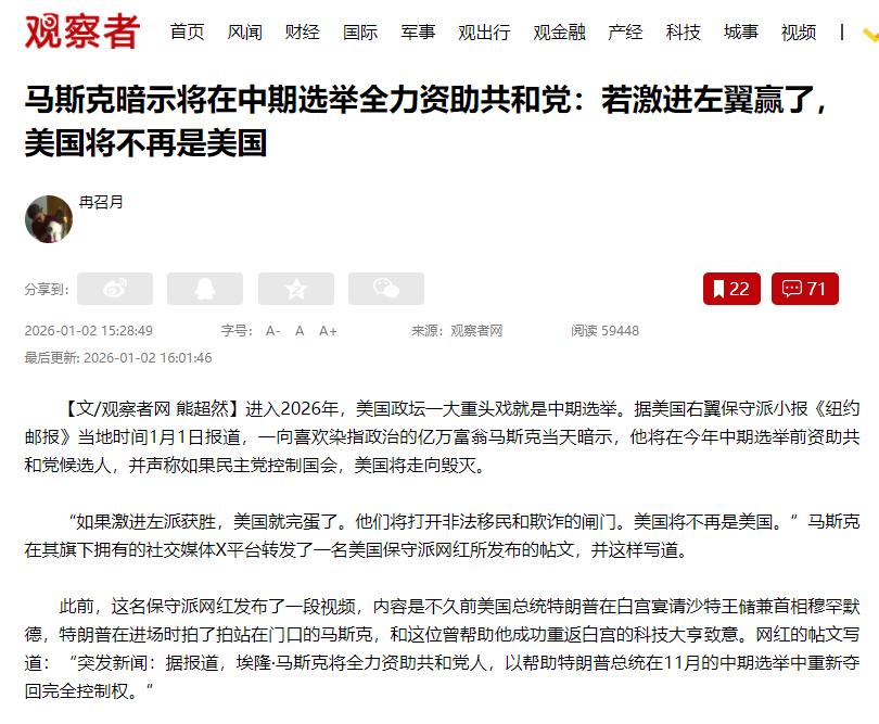 马斯克重回特朗普“怀抱”!他还放狠话,说中期选举要全力资助共和党,要是“激进左翼”赢了,美国就不是美国了。别听他瞎忽悠,这根本不是啥爱国口号,就是2026年美国中期选举前的利益交换信号! 说白了,马斯克就是为了保住自己的商业帝国,才跟特朗普重新抱团,背后全是有钱人的算计和美国政坛的肮脏事儿。 2026年美国政坛最大的事儿就是中期选举,谁掌控国会谁就说了算。据美国右翼的《纽约邮报》1月1日报道,马斯克这时候跳出来说要给共和党候选人砸钱,还说民主党要是掌控国会,美国就完了。 有人纳闷,他俩之前不是闹得挺僵吗?怎么又凑一起了?其实俩人的关系从来都是看钱说话,合久必分、分久必合,现在重新联手,就是因为有共同的敌人——民主党,核心目标就一个:把民主党赶下台,保住自己的利益。 俩人的恩怨全是钱闹的。早几年马斯克还支持民主党,后来跟民主党闹掰,转头倒向共和党。 2024年特朗普竞选总统时,马斯克真金白银地砸钱,帮他拉选票,俩人好得跟一个人似的。 可后来特朗普政府要取消电动车补贴、加征费用,直接戳了马斯克的痛处,特斯拉全靠政府补贴卖车,没了补贴销量肯定暴跌。 马斯克急了,公开骂特朗普的政策,俩人就此翻脸互怼,特朗普还威胁要终止他公司的政府合同。 但利益面前没有永远的仇人,没过多久俩人又和好了。去年11月,在副总统万斯的撮合下,马斯克跟白宫官员吃了顿晚饭,之后就重启了对共和党的资助。 现在马斯克放狠话,其实就是怕民主党上台后,不仅特斯拉的补贴保不住,他的SpaceX公司从政府拿的巨额合同也会泡汤。要知道,SpaceX大部分收入都来自政府订单,美国政府想离开它都难。 美国的选举早就成了烧钱游戏,2026年中期选举预计要花167亿美元,谁钱多谁胜算就大。 马斯克有的是钱,资助共和党根本不是慈善,就是稳赚不赔的买卖,只要共和党掌控国会,出台的政策就会偏向他的企业,到时候赚的钱比捐出去的多得多。 说到底,马斯克跟特朗普重新抱团、全力资助共和党,就是纯粹的利益交换。特朗普需要马斯克的钱和影响力赢选举,马斯克需要共和党掌权保住自己的商业帝国。 俩人把国家选举当成自己的生意筹码,真是让人看不起。马斯克说民主党赢了美国就完了,其实真正要完的,是普通老百姓对美国政治的信任。这俩人联手,也让我们看清了美国政治金钱至上的真面目,实在是荒谬。