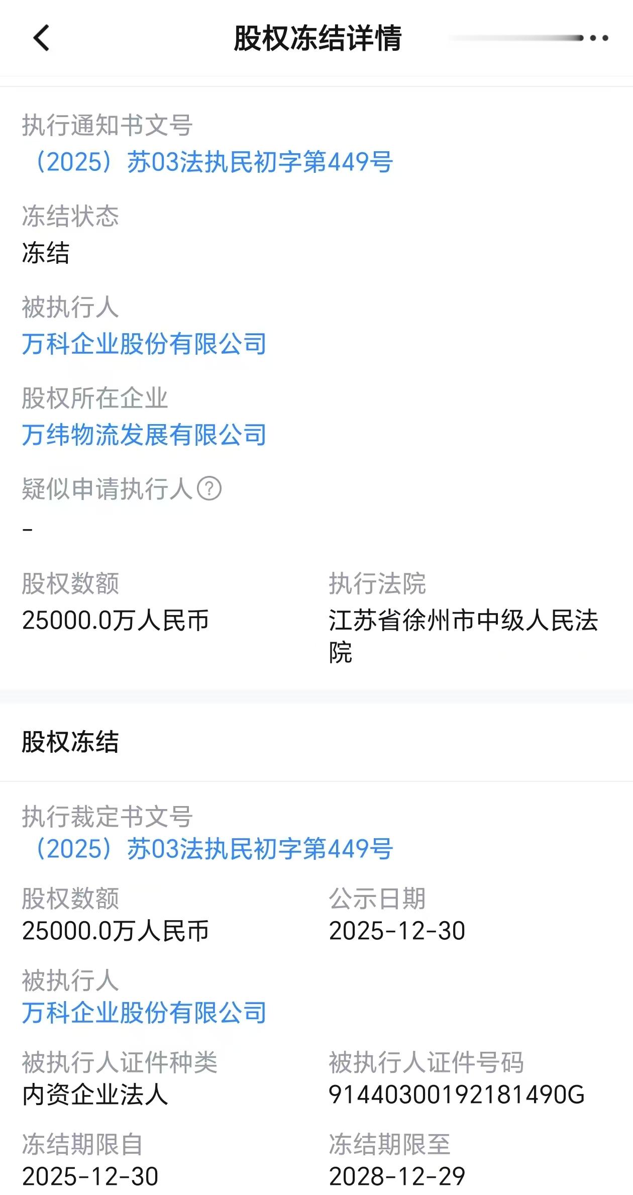1月4日,界面新闻从天眼查APP获悉,日前万科企业股份有限公司(简称万科)新增一则股权冻结信息,股权所在企业为万纬物流发展有限公司,冻结股权数额2.5亿元人民币,冻结期限为3年,执行法院为江苏省徐州市中级人民法院。