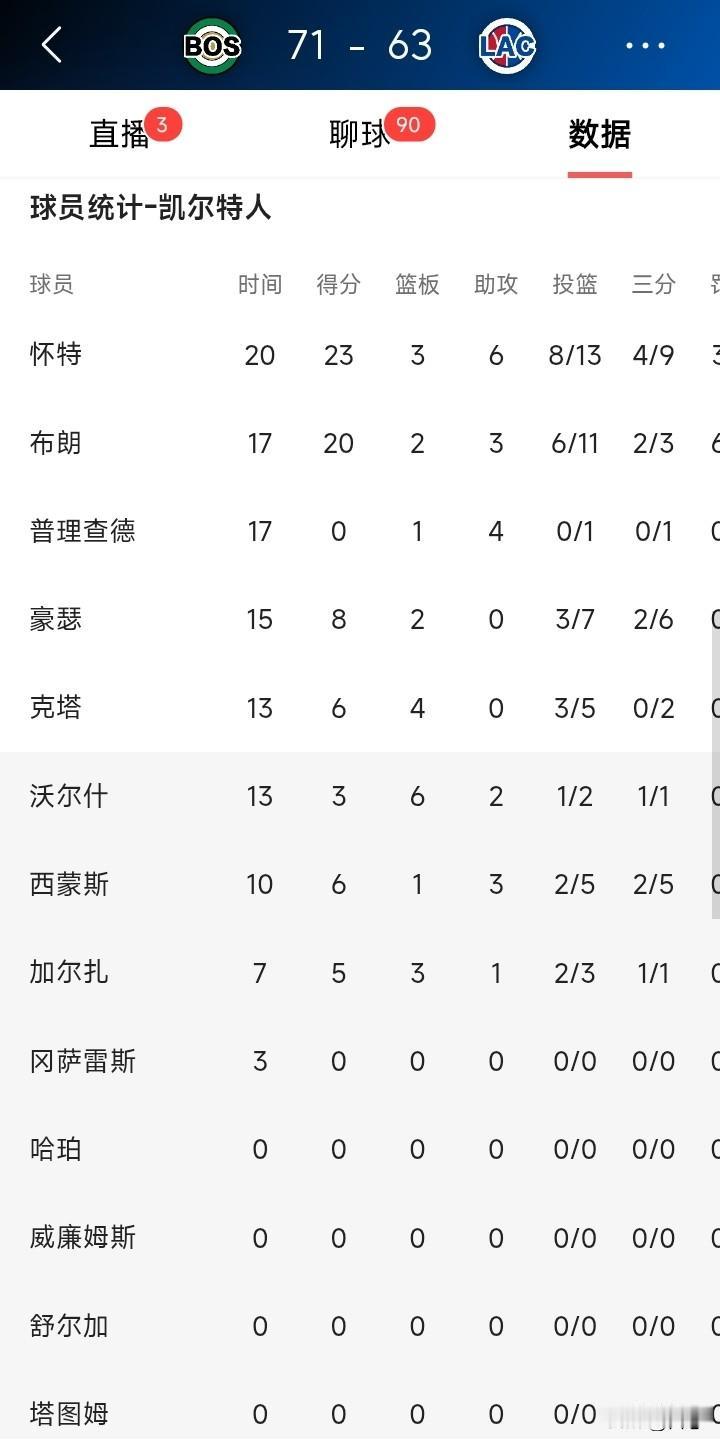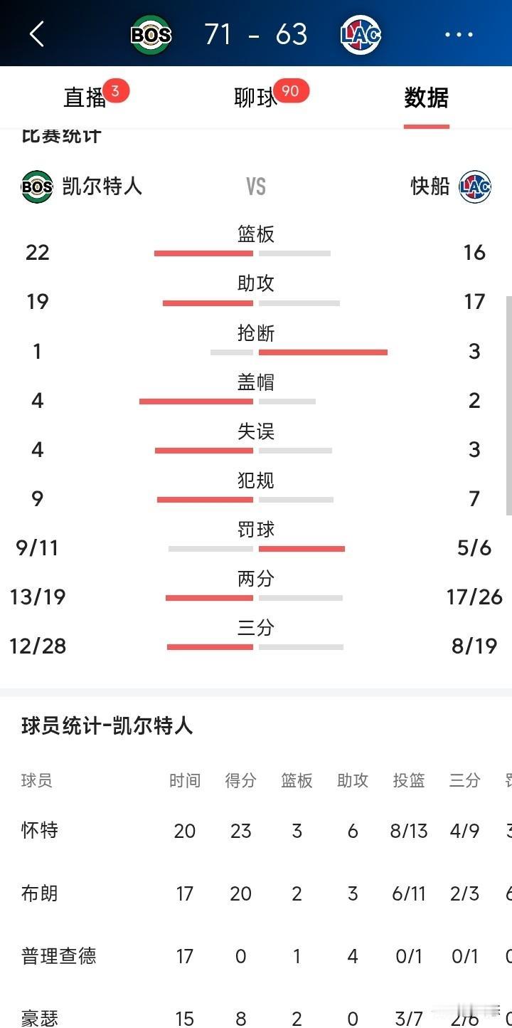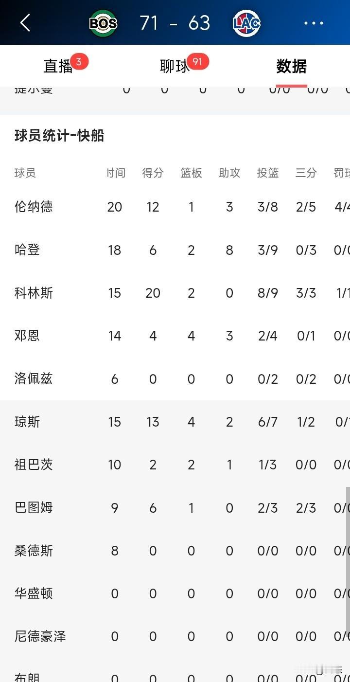 快船对阵凯尔特人上半场63比71,分差8分,上半场凯尔特人命中率太可怕,三分球大