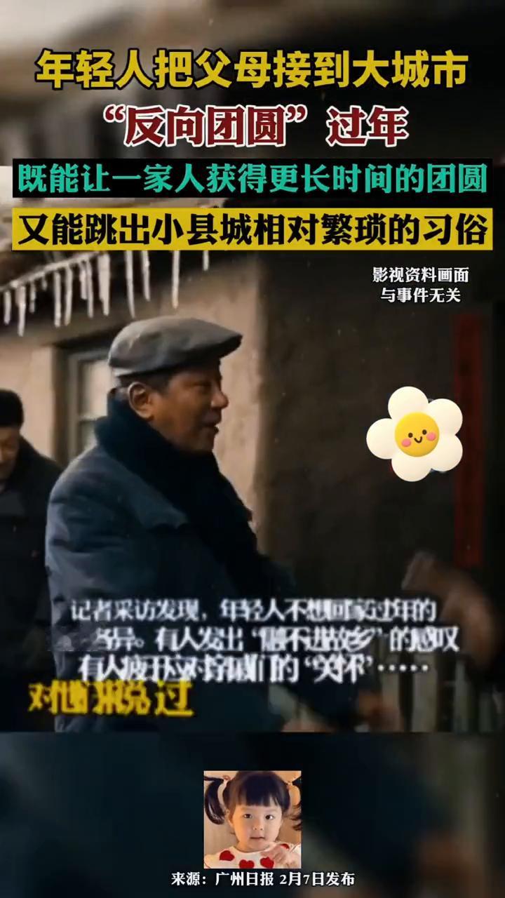 年轻人把父母接到大城市"反向团圆"过年。 广州日报。 近日"当代年轻人在过一种很新的年"成了热议话题,在"怎么过年"这件事上年轻人越来越有自己的主见。记者采访发现年轻人不想回家过年的理由各异,有人发出"融不进故乡"的感叹,有人疲于应对亲戚们的"关怀"。对他们来说过年回家难免要经历"精神内耗",年轻人不回家过年并不代表他们完全抛弃了传统的春节生活方式。 有不少年轻人表示今年春节与家人达成共识,把父母接来自己所在的大城市一起过,既能让一家人获得更长时间团圆,也能让年轻人和父母体验到丰富的城市春节氛围,更能跳出小县城、村里相对繁琐的礼节和习俗,这使得"反向过年"成为不少年轻人心中的"首选"。