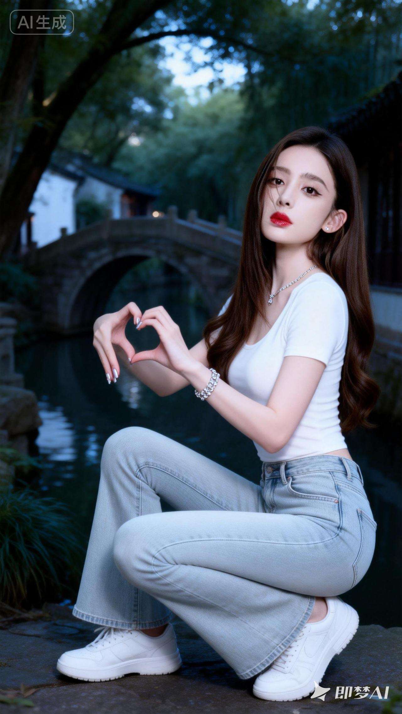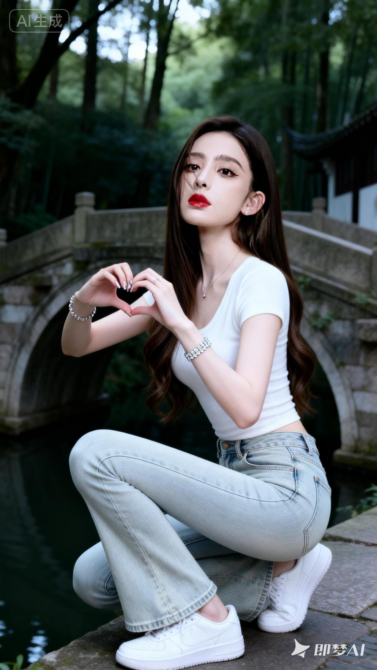 在古桥下,她用双手比出爱心,温柔地微笑着。