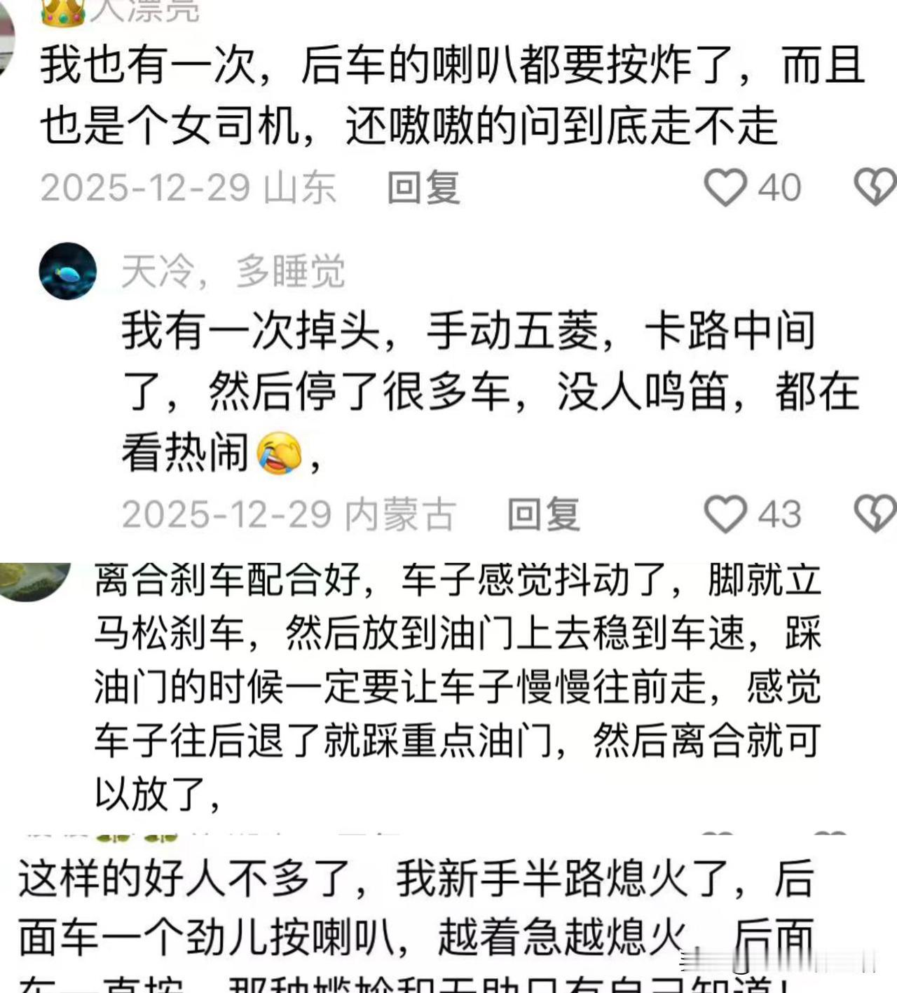 新手司机的噩梦!半坡起步真能逼疯人 新手司机最怕啥? 必须是半坡起步! 这事儿谁开谁知道,油门不敢踩,刹车不敢松,生怕溜车撞上后车。 视频里这位女司机,出停车场就卡斜坡上了。上不去,也不敢往下倒,直接僵在原地。同车的大姐没辙,只能下车,向后面静排队的等候车求助。 关键时刻,对向车道来了个热心大哥。老司机一眼看穿状况,二话不说下车,帮女司机把车开了出去。 其实,半坡起步难倒的不只是女司机,很多新手都栽在这。停车场斜坡、立交桥匝道,但凡有点坡度,都能让新手手心冒汗,主要是油门和离合配合不好,心理素质也没跟得上。 当然,老司机是过来人,总说开车这事儿,熟就能生巧,所以,新手别怕丢人,多练几次才能找到感觉。最主要是遇到难处,别慌!找人!总有人会愿意伸把手。 大家的第一次半坡起步是啥心情?
