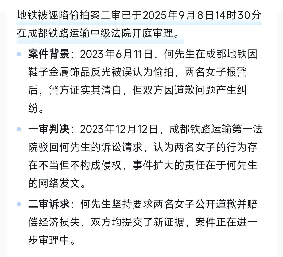 不是吧 这哥们居然还在打官司 地铁被诬陷偷拍的男子还在打官司维权 现在是二审了 从23年6月到现在已经过去两年了 不得不佩服他的毅力 也从侧面说明打官司真的是一场持久战 这哥们精神值得嘉许 “小仙女”张口就诬陷,却不用负任何实质惩罚 搞得草木皆兵,人人自危 “小仙女”自以为可以躲过一切 结果遇到这样认真的人 虽然一审结果令人失望 可是也让对方疲于应对,也算聊以慰藉了 二审的结果 大概率也不会有太多变化 但是! 也让某些“小仙女”明白 遇到认真的人 也不是跟你开玩笑的 即便打不赢,也要烦死你!
