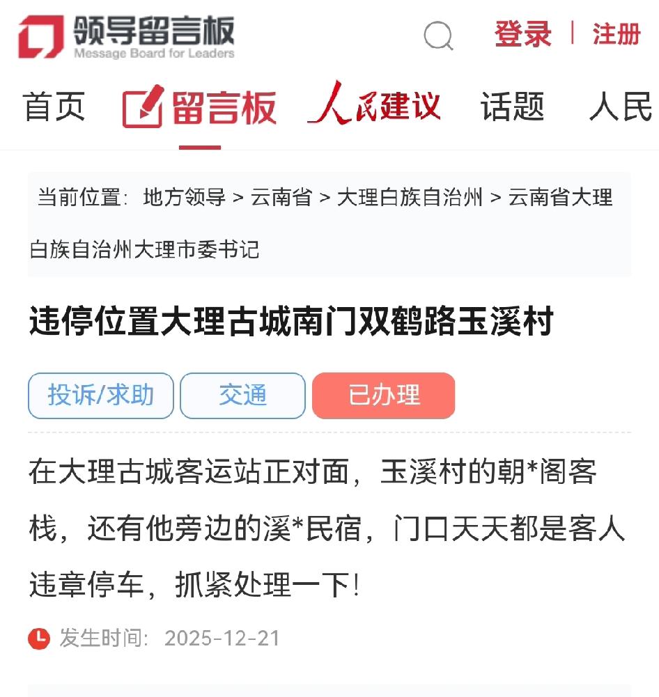 大理古城民宿门口违停乱象,官方出手整治。 近日有网民通过人民网领导留言板反映,大理古城南门双鹤路玉溪村的潮阁客栈和溪民宿门口长期存在客人违章停车现象,严重影响周边群众出行安全。 大理市公安局交通警察大队迅速回应,经核实玉溪村道路狭窄,民宿集中违停问题确实存在安全隐患。对此官方已采取两项措施: ·一是增派警力现场劝导,规范停车秩序。 ·二是联合村委会加强村规民约宣传,并合理规划停车资源。 大理市交管部门表示将持续关注整改效果,确保居民出行安全。 大理乱停车 大理路边停车费 停车