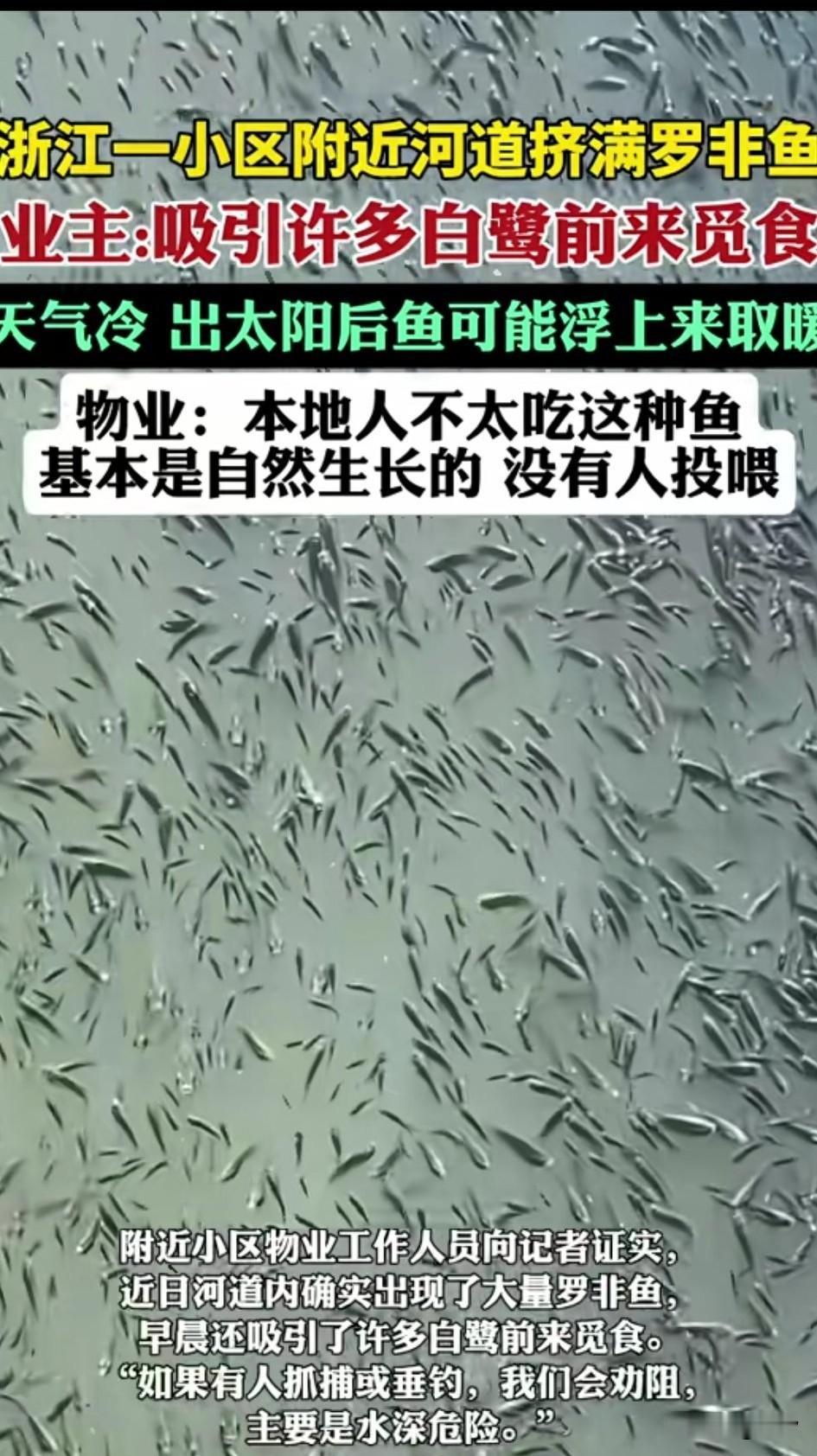 浙江一小区河道挤满了罗非鱼, 看着密密麻麻的罗非鱼, 对于有密集恐惧症的人来说, 这简直是太可怕了, 这么多的罗非鱼吸引了不少白鹭来猎食,小区居民也是无可奈何, 因为他们都不喜欢吃罗非鱼, 所以也没有人去捕捉, 造成了小区罗非鱼泛滥, 物业也表示没有人去投喂, 这些都是自然生长的, 也有可能是某位业主放生的, 毕竟当地没有这种品类, 外来物种的繁殖速度真的相当可怕, 数量如此之多,看来是没有天敌, 这些罗非鱼可能是怕天冷, 这才纷纷出来晒太阳, 平时河道里根本看不到, 现在全都跳了出来, 看着十分的夸张, 也不知道小区的猫咪多不多, 多了的话可以去尽情捕猎, 大家知道罗非鱼如何烹饪吗? 浙江 罗非鲫鱼 罗非钓鱼 水产罗非鱼 罗非鱼市场 罗非鱼寄生虫 草墩罗非鱼