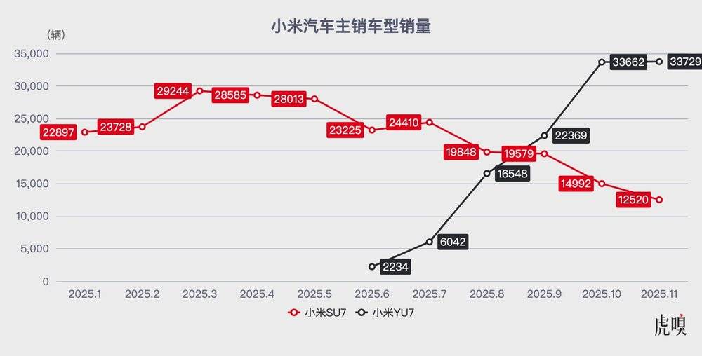 虎嗅认为,在国内车市步入“微增长”阶段的当下,小米汽车年交付55万辆是一个相对较为现实的目标。如果将该目标拆解,便会发现其实现路径已经基本清晰:YU7保持3万-3.5万的月交付量;SU7保持1万-1.5万的月交付量。