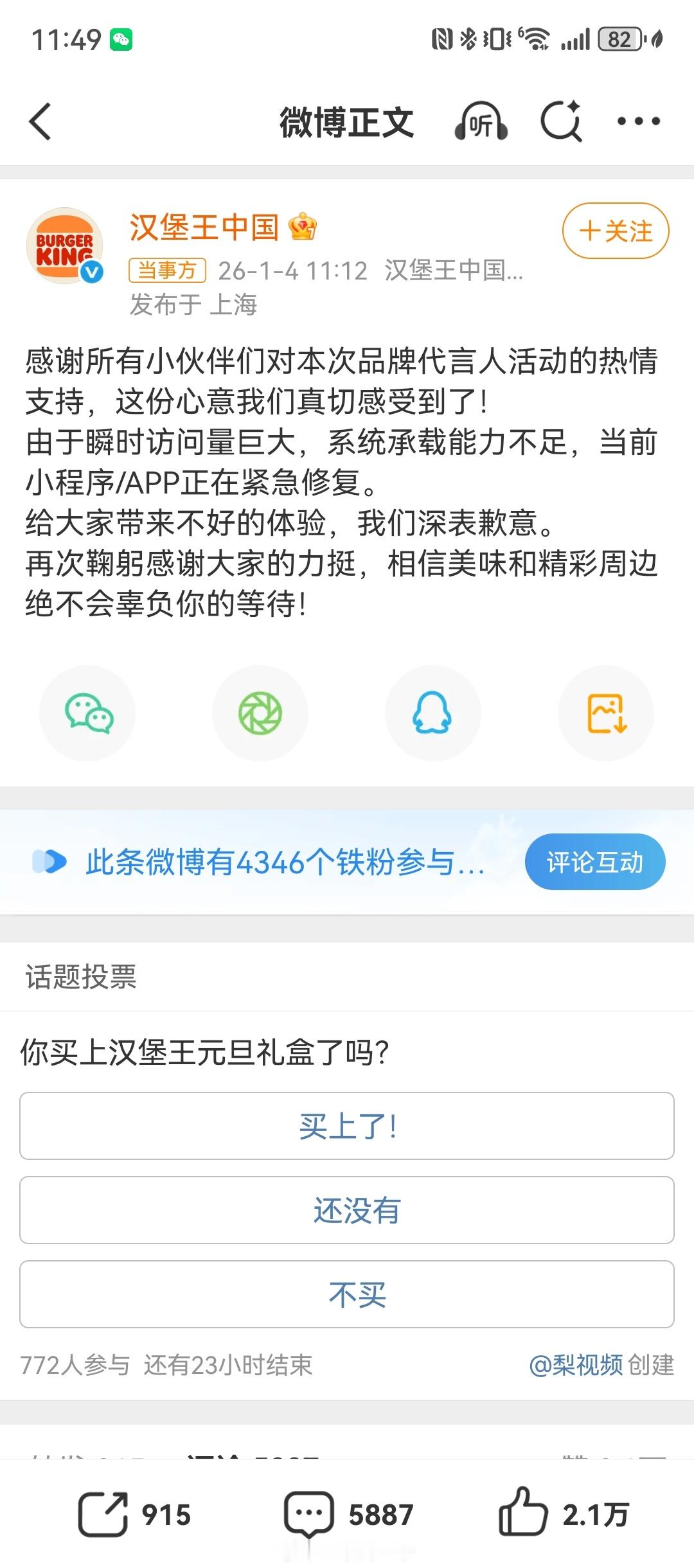 汉堡王就崩溃道歉田栩宁这么火的吗,3000多万点赞,难怪汉堡王顶不住崩了…… 汉堡王称已在紧急抢修 汉堡王崩了