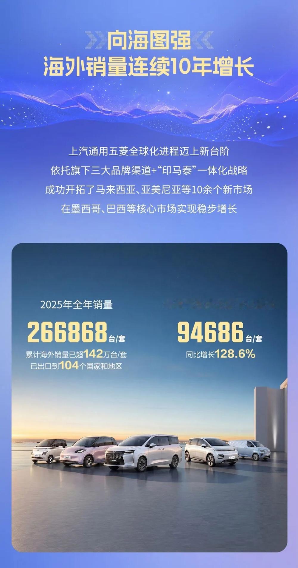 新能源出海新范本!上汽通用五菱不仅是中国第一,更是跻身全球前三。 一面是缤果、宏光MINIEV两大家族分别实现213367辆、435598辆的爆款数据,一面是新能源累计销量在短短一年内、从240万+辆提升至340万+辆,上汽通用五菱的2025年是真正挤入到了新能源赛道的领军位置。也是依靠着新能源转型的成功,上汽通用五菱的单年整体销量也达到了163.5万辆,进一步巩固了“中国车企历史累计第一(3166万辆)”的地位。 更让人欣喜的是,五菱在加速新能源转型的过程中,也在积极响应国家的“一带一路”倡议,完成了对于东南亚市场的重点拓展,进而完成了对全球104个国家和地区的覆盖。在海外累计销量突破142万台套的情况下,新能源累计销量也已位列全球前三。 我觉得,五菱在出海这件事上是有着自身独特优势的,其不仅依托“印马泰”一体化战略构建起了“核心枢纽+区域辐射”的全球化网络,更依靠旗下三大品牌的不同渠道优势,跑通了“整车出口、散件输出、整车基地建设”三线并行策略。这样一来,五菱不仅能快速拓宽渠道、输出产品,更能够将销售、金融、制造、人才以及供应链全面输出到海外市场,带动当地产业协同发展,真正成为中国新能源出海的新范本。