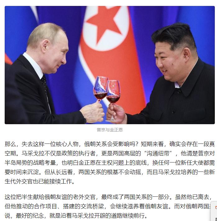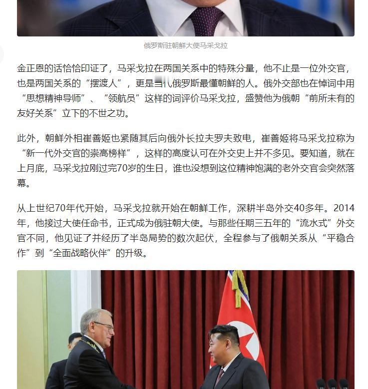 深耕俄朝外交 40 余年的俄驻朝大使马采戈拉逝世,获金正恩等朝俄高层高度赞誉,其推动两国达成多项合作、促成战略伙伴关系,虽短期影响双边沟通,但长远关系根基稳固。 原文来自头条创作者华府萝贝贝的文章: