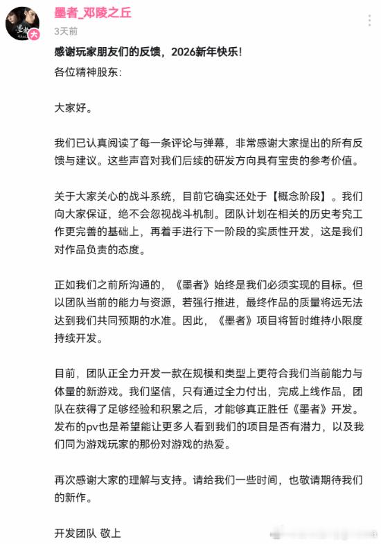 国产《墨者:邓陵之丘》将暂缓大规模开发前些日,国产沉浸式动作角色扮演游戏《墨者:邓陵之丘》公布首支实机预告。在实机预告播出后,面对部分玩家觉得预告片僵硬粗糙的问题,官方置顶评论回复道:“各位玩家朋友,大家好。*此Pv【概念展示】了《墨者》早期实机演示,战斗系统等核心玩法仍在开发中。目前的战斗与镜头为了先让游戏能跑起来,毕竟墨家是个较难驾驭的题材,我们需要先确保剧情世界观价值观的完善,并暂缓大规模开发,将先完成一款能力范围内的游戏新作之后,再回来完成我们的梦想。*感谢大家的指正与建议,这将是我们进步的宝贵财富”根据官方透露,新游是一款单机买断制第一人称科幻游戏。目前该实机预告在B站播放量已达58.4万,点赞数达3.2万。《墨者》是一款以秦朝末年为历史背景、围绕墨家思想构建的沉浸式动作角色扮演游戏。玩家将以一名墨家弟子的视角,通过探索、战斗与抉择,寻根溯源,在这片真实而粗砺的秦末江湖中走出属于自己的道路。