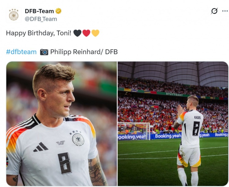 德国队官方社媒晒出克罗斯效力期间的照片,配文:“生日快乐,托尼!”