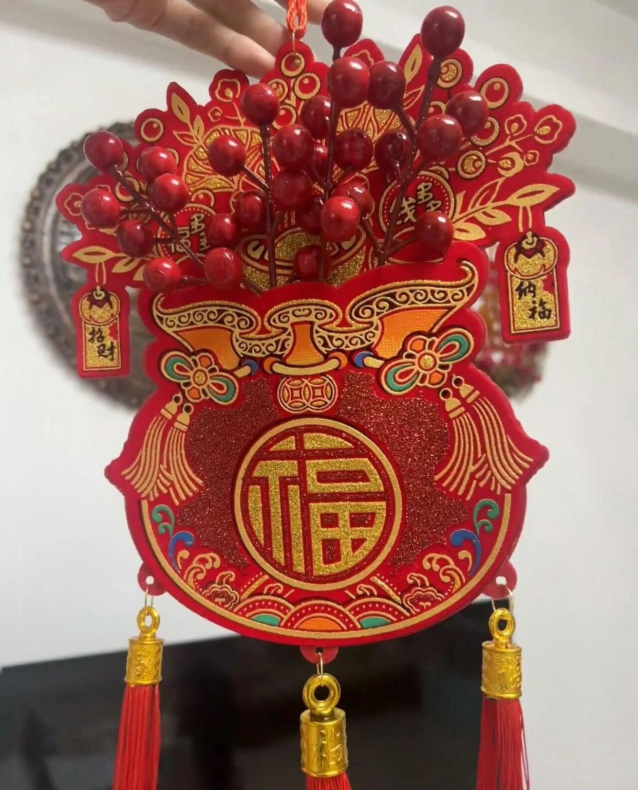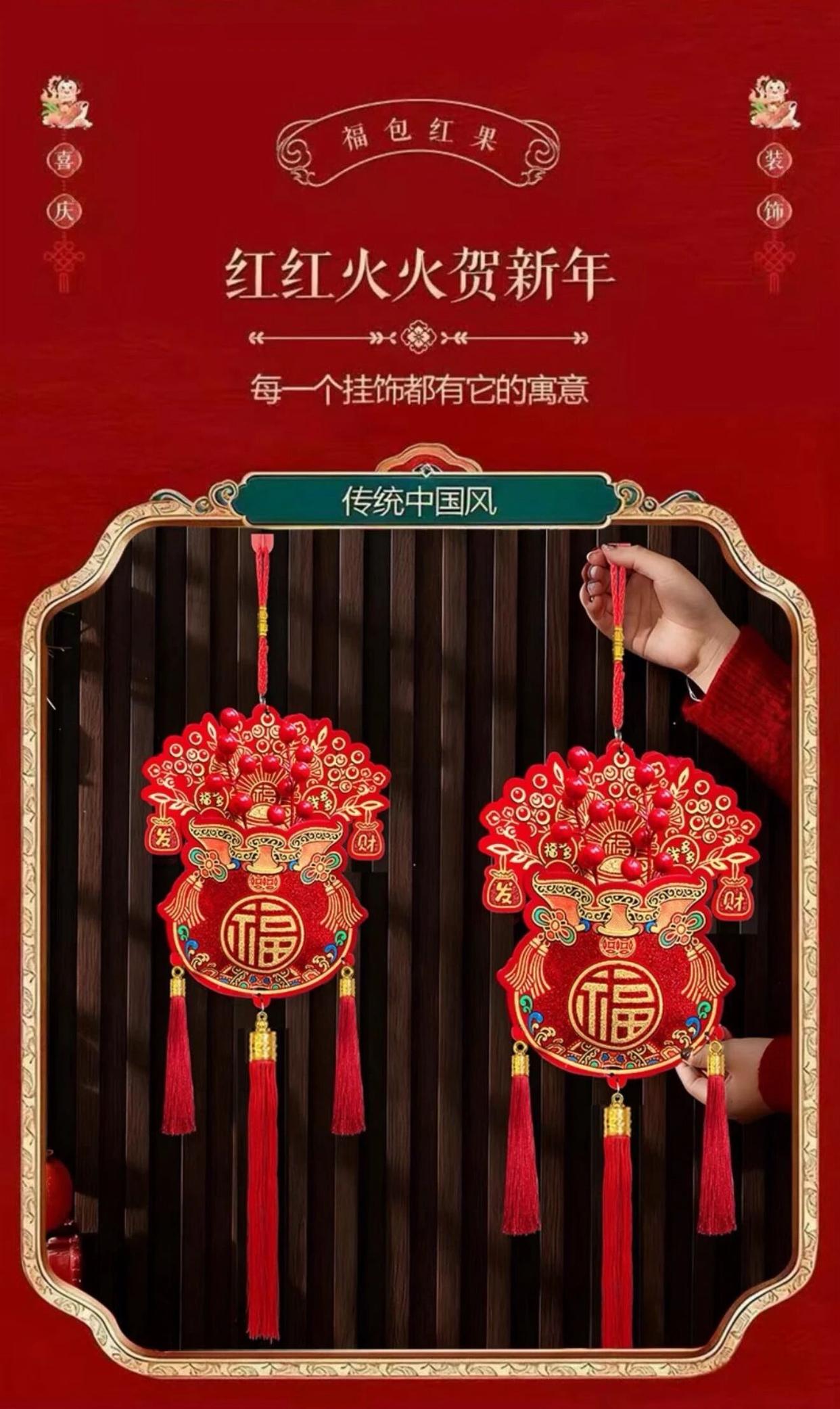 中国红的主色调热烈奔放,自带红红火火的氛围感,一挂上就瞬间点亮整个空间,成为视觉焦点。搭配精致烫金工艺,传统纹样熠熠生辉,既有古典韵味又不失时尚感,颜值与寓意双双在线。