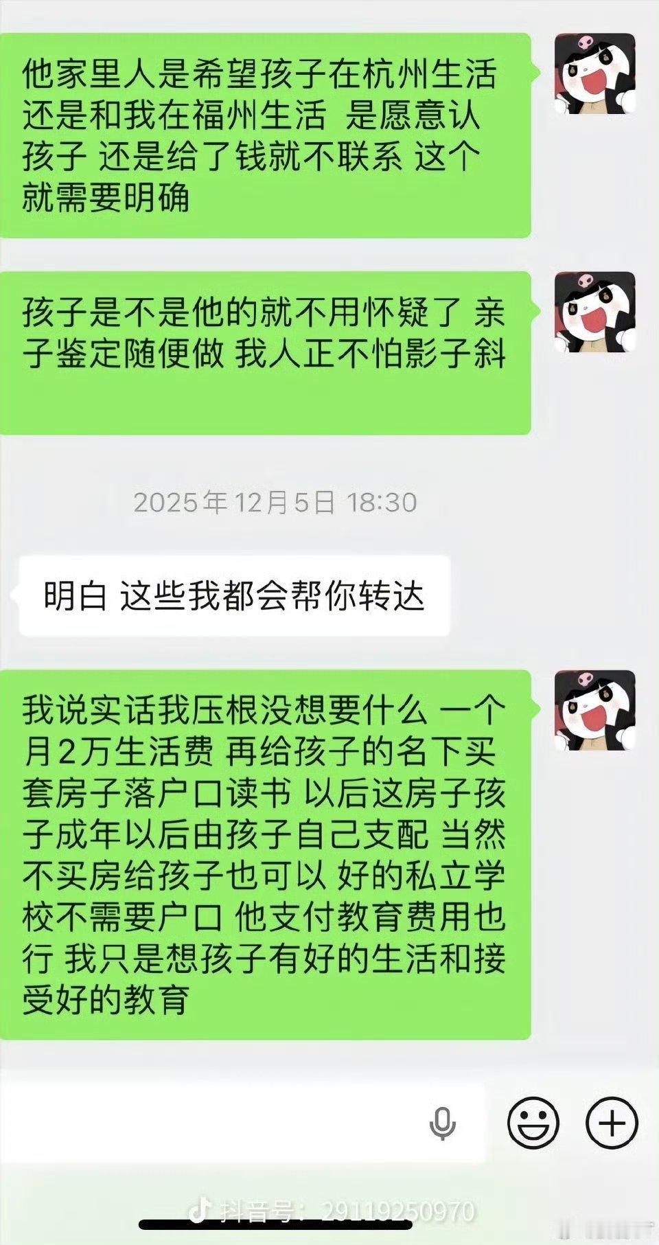 童锦程孩子妈回应要220万 这姐们,属于典型的话说多了,连自己说过什么都不记得了。正好我记性不错,记得她在钱财上面的要求。看图2,她对童锦程的要求,曾直接提高至2万每月的生活费,此外还想要童锦程给孩子买套房子,用于落户口读书。她说,她只想给孩子一个好的生活以及教育条件。但这话,明眼人一看就知道假的离谱。所谓的给孩子更好的生活,实际上是给自己更好的生活。因为,大多数孩子的养育成本,压根就到不了每月2万。像是童锦程愿意给的5k,就已经很不错了。母凭子贵,实际上非常困难。责任感这种品格,很难在有钱人体现,至于浪子,那更是想都别想。还是趁热度还在,多搞点钱吧。孩子妈曝童锦程想毁灭证据