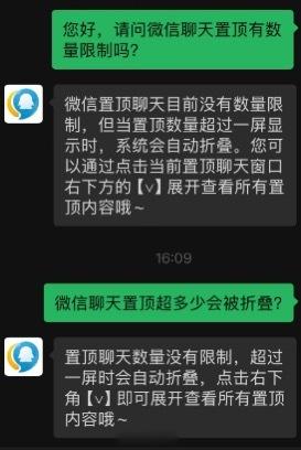#微信聊天置顶超过一屏自动折叠#[#腾讯客服回应微信置顶数量#:暂未设定具体数量]1月4日,爸爸微信有两千个置顶话题登上热搜,引发网友热议。针对微信聊天置顶是否有数量限制这一问题,@财经网科技联系到腾讯客服。客服回应称:微信置顶聊天目前没有数量限制,但当置顶数量超过一屏显示时,系统会自动折叠。此外客服还表示,可以通过点击当前置顶聊天窗口右下方的[∨]展开查看所有置顶内容。
