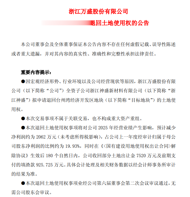 1月4日,万盛股份(603010.SH)发布关于全资子公司退回土地使用权的公告,因宏观经济形势、行业环境以及公司经营现状等原因,浙江万盛股份有限公司全资子公司浙江神盛新材料有限公司拟申请退回台州湾经济开发区地块的土地使用权。