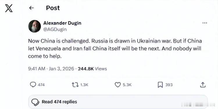 *俄罗斯政治学者杜金 1 月 3 日发文指出:“如果中国放任委内瑞拉和伊朗同时沦陷,下一个遭殃的将是中国自己,届时恐怕没有人会伸出援手。 最近南美国家委内瑞拉的局势闹得沸沸扬扬,首都街头的爆炸声、盘旋的直升机,让这个远在西半球的国家一下子成了全球焦点。 可能有人觉得,隔着十万八千里的事,跟咱们普通老百姓有啥关系? 但其实这里面的门道,直接连着咱们的饭碗、咱们买的东西,甚至未来的日子安稳与否。 先说说委内瑞拉现在到底乱到啥程度,官方已经宣布进入国家紧急状态,首都部分区域断了电、没了信号,关键军事设施附近还发生了多起爆炸。 更让人揪心的是,有国家直接动了武力,美军于 1 月 3 日凌晨对委内瑞拉实施大规模军事打击,抓获总统马杜罗及其夫人。 此前,美国海岸警卫队曾于 2025 年 12 月在委内瑞拉附近海域扣押油轮。 这种直接打上门、侵犯别人国家主权的事,不光当地民众抗议,周边国家也都炸了锅,不少国家公开谴责这种做法,就连动手国家内部,也有不少人质疑这事做得不合法。 为啥说这事跟咱们有关系,先看实实在在的贸易往来。咱们和委内瑞拉自 1974 年 6 月 28 日建交,至今已有 51 年,一直是实打实的合作伙伴,一直是实打实的合作伙伴。 去年一年,两国做的生意就有几十亿美元,而且还在往上涨。 咱们平时开的汽车、骑的摩托车,不少都是从中国卖到那边的,还有支撑当地生活的通讯设备、电机、日常穿的衣服鞋子,这些都是咱们国内企业生产的。 光去年一年,就有一万七千多辆汽车、五十七万多辆摩托车卖到当地,背后是国内数千家企业的生计,还有数万工人的工资饭碗。 2025 年以来,中国对委内瑞拉出口保持增长,其中汽车出口增长 130%,塑料、橡胶制品等民生用品前三季度出口金额同比增长 4.2%,保持稳定供应态势。 除了这些看得见的商品,还有更深层的合作,委内瑞拉是全球有名的石油储备国,曾经是咱们国家重要的能源来源地,而咱们帮他们发射通信卫星、遥感卫星,援建基础设施,在航天、教育、扶贫这些领域帮了不少忙。 委内瑞拉是拉美地区首个加入中国发起的国际月球科研站计划的国家,双方在航天领域开展广泛合作,几十年下来,早就形成了“你离不开我,我离不开你”的关系。 现在那边一乱,港口被封、设施被打,咱们过去几十年的投资、合作的项目,还有未来的合作机会,都面临着风险。 再往深了说,这事儿本质上是“弱肉强食”的霸权逻辑在作祟,有国家觉得自己拳头硬,就可以随便干涉别人的内政,想打谁就打谁,想扣谁就扣谁。 而委内瑞拉偏偏不低头,坚持自己的发展道路,还跟咱们保持深度合作,这就成了被针对的理由。 有人可能觉得,这是人家“后院”的事,但要知道,霸权主义从来不会知足。 这次能随便打委内瑞拉,下次就能对其他坚持自主、跟咱们合作的国家动手。 要是这种逻辑得逞了,以后咱们在海外的投资、合作的项目,随时可能因为别人一句话、一次武力行动就泡汤,咱们的海外利益根本没法保障。 更关键的是,现在国际上不少国家都看不过去了。这些声音其实都是在警惕霸权扩张,要是连国家主权都能随便被侵犯,那世界上就没几个国家能安稳发展了。 对咱们普通老百姓来说,这事真不是“远在天边”,你买的家电可能就来自中委贸易的生产线,你身边有人在相关企业上班,他们的工作稳定与否,就跟这些国际合作挂钩。 而国际秩序的稳定,更是咱们能安安稳稳过日子的前提,要是以后到处都是“以强凌弱”,咱们出门旅游、企业对外做生意,都会处处受限,甚至面临风险。 其实杜金的话,核心不是要挑事,而是提醒大家:现在的世界早就连在一起了,没有哪个国家能独善其身。 委内瑞拉坚持独立自主、跟咱们平等合作,没碍着谁,却遭了难,要是这种事没人管、没人发声,以后类似的遭遇可能会落到更多国家头上。 咱们支持委内瑞拉维护自己的主权,不是要介入冲突,而是要守护一个基本规则,不能让拳头大的就说了算,不能让好好合作的国家平白遭殃。 说到底,这事儿不光关乎委内瑞拉老百姓的安危,更关乎咱们每个人的长远利益。 一个公平、稳定的国际环境,才能让咱们的生意做得安稳,让咱们的日子过得踏实。 所以别觉得南美那边的事跟自己没关系,它其实在提醒我们:维护公道,就是保护自己。