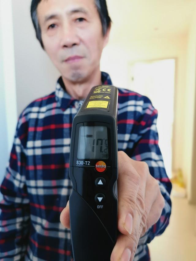 “往年室温能达到21℃至22℃,今年明显差很多。”刘先生说,他曾两次向龙房供热反映情况,工作人员上门测温后均称达标,还劝说他在测温单上签字,“说不签字回去没法跟领导交差,我体谅他们工作不易,就签了字,可室温始终没提上来。”为核实室温真实情况,记者使用专业测温仪进行检测。10时50分的数据显示,刘先生家客厅室温为18.2℃,南侧卧室18.4℃,北侧卧室仅17.2℃。