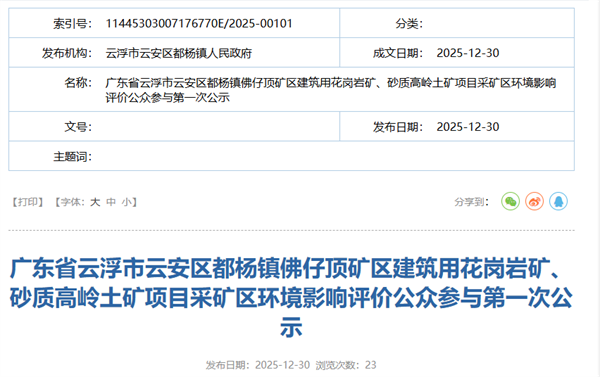 2025年12月30日,广东云浮市云安区都杨镇人民政府公示广东省云浮市云安区都杨镇佛仔顶矿区建筑用花岗岩矿、砂质高岭土矿项目采矿区环境影响评价。