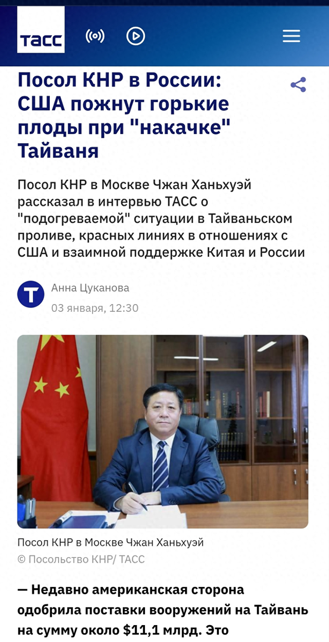 1月3日,张汉晖大使就美方大规模对台军售接受塔斯社书面采访。采访全文如下: