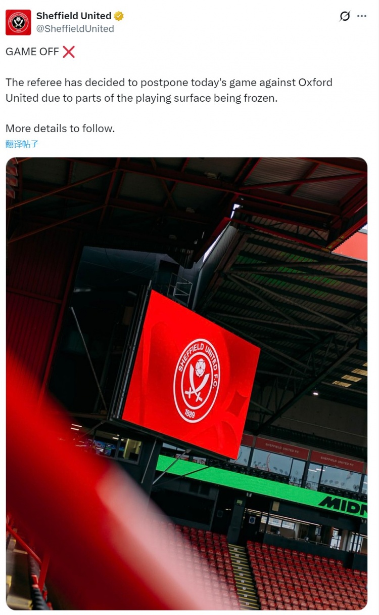 谢菲联主场对阵牛津联的英冠第26轮比赛原定北京时间今晚20点进行,谢菲联发布公告,确认裁判决定本场比赛延期,原因是比赛场地部分区域结冰。