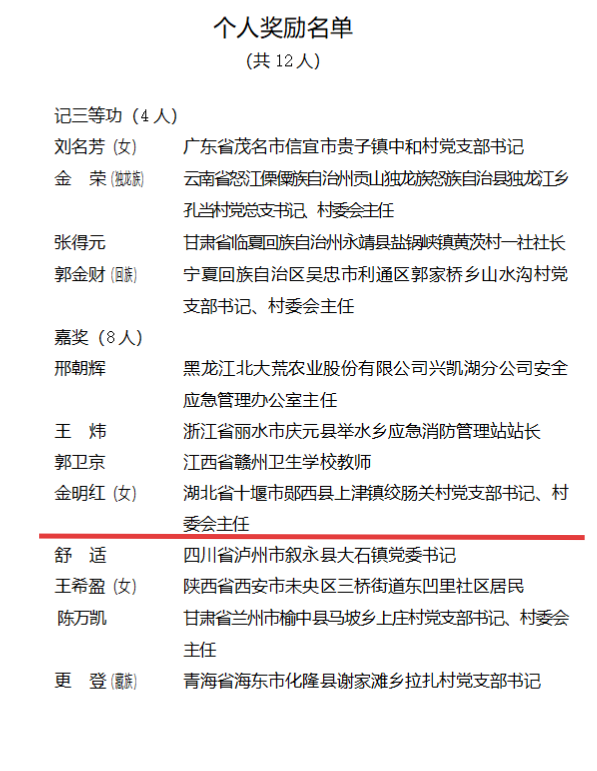 为奖励先进、鼓舞士气、推动工作,根据《应急管理系统奖励暂行规定》,应急管理部决定,对在基层防灾避险工作中作出突出贡献的12名同志给予奖励,十堰市郧西县上津镇绞肠关村党支部书记、村委会主任金明红获嘉奖。