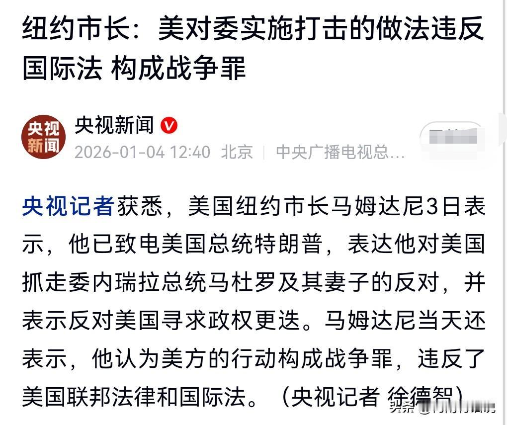 美国还是有正义的声音的。当地时间1月3日。 纽约市长表示:美对委实施打击构成战争罪。 这个声音就非常的正义了。美国的行为确实是是构成了战争罪,应该追责,但是没办法。美国实力强,谁也不敢动。 这真的很悲哀的一个事情。 什么时候美国会受到正义的审判呢? 特朗普政府真是一个无法无天的政府。 帝国主义太可怕了。美对委实施打击构成战争罪