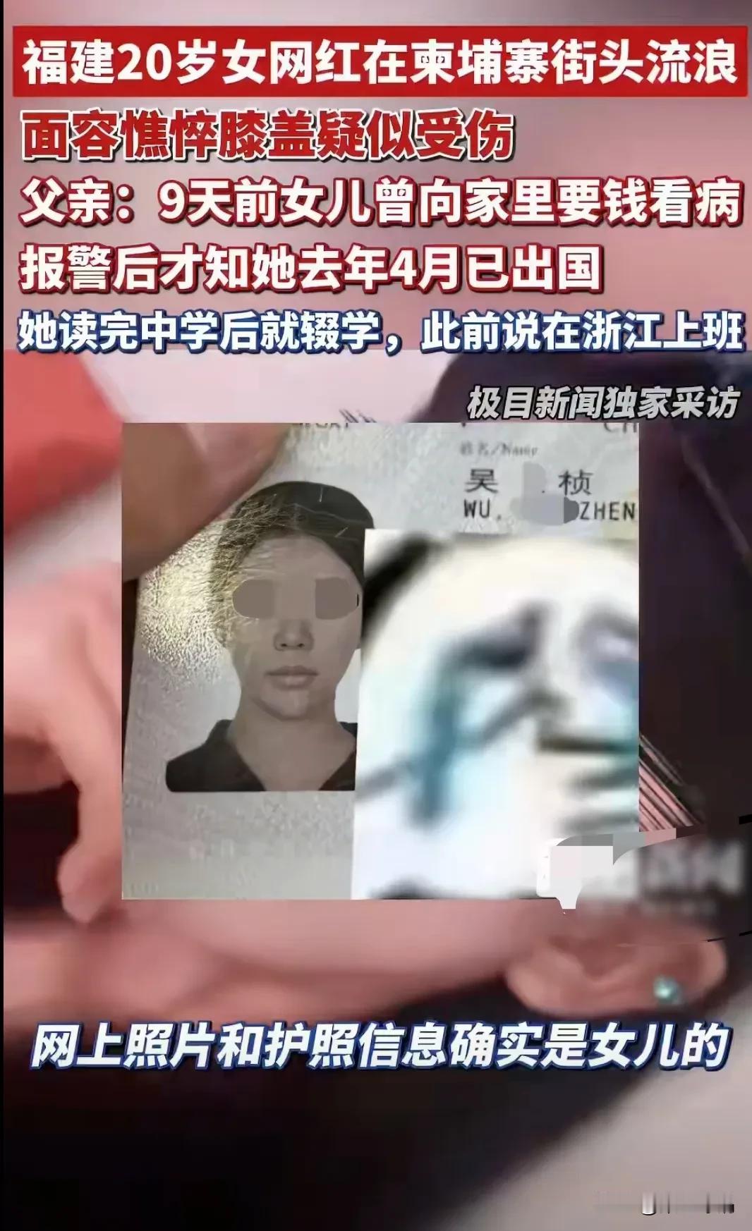 在柬埔寨流浪街头的女子, 她的妈妈终于出来回应了, 其实在九天前听到她受伤的时候已经给她发过八万块钱过去了。她早在中学后就辍学,之前是在浙江上班,一年大部分时候也就是过年的时候回家。 这件事情让人疑惑点挺多。 1.长得那么漂亮,网络上还有着2.5w的粉丝量,当个主播,带个货估计都有不错的收益,为什么非得要跑出国了去呢? 2.家里听到她受伤,立马就发8w过去,可见家里也是小康之家,这样的家庭为什么舍得让她中学后辍学呢? 3.一年大部分的时候也就过年回去,不是因为赚钱太勤奋,没时间回去,就是跟家里的感情其实一般,难怪连女儿出国这事都是后面出了事才知道。