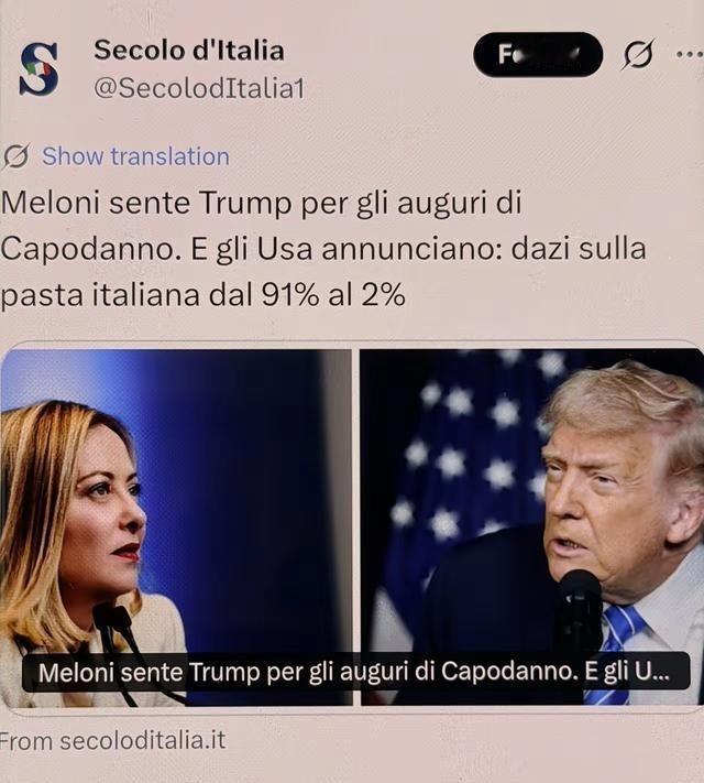 这波配合让网友目瞪口呆!梅洛尼与 特朗普 通电话致以新年祝福,然后美方宣布:将 意大利面 的关税从91%降至2%。 2025年12月31日,梅洛尼通过官方渠道联系特朗普,两人先互致新年问候,讨论北约合作。谈话转向贸易,梅洛尼指出意大利面出口对经济重要,2024年对美销量近8亿美元。美商务部此前决定额外征收最高92%关税,针对13家企业。她提供数据证明企业未倾销,特朗普表示会让部门审查。通话后,意大利外交部协调大使馆提交财务报告和市场资料。 2026年1月1日,美商务部公布调整:La Molisana税率降至2.26%,Garofalo为13.98%,其余统一9.09%,加在欧盟15%基础关税上。意大利农业部长称此举认可企业合作,避免了潜在损失。农民协会主席表示政府渠道有效,保护了逾6亿欧元出口。媒体报道此事引发讨论,强调意大利面文化意义,企业受益于维持美国市场份额。 商务部解释基于补充信息加速审查,原计划3月结束。意大利出口商协会计算,每年节省数千万欧元。观察者指出,此调整显示特朗普对盟友灵活性。意大利外交部视电话为常规交流,涵盖全球事务,但分析认为针对贸易摩擦。企业如La Molisana感谢政府,指出低税率支持分销网络。 美国本土生产商曾投诉意大利产品低价进入,导致调查启动。意大利回应强调供应链公平,无补贴迹象。关税下调后,美国消费者价格稳定,意大利工厂就业得以保障。