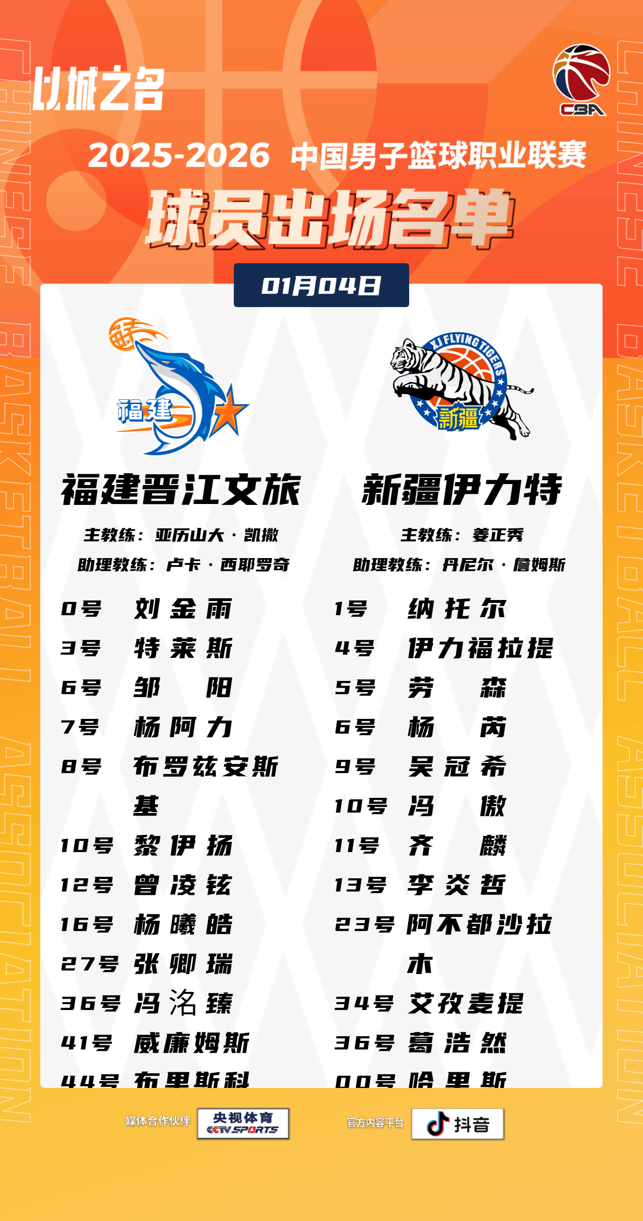 虎扑01月04日讯今日CBA常规赛,福建对阵新疆的大名单已经出炉。