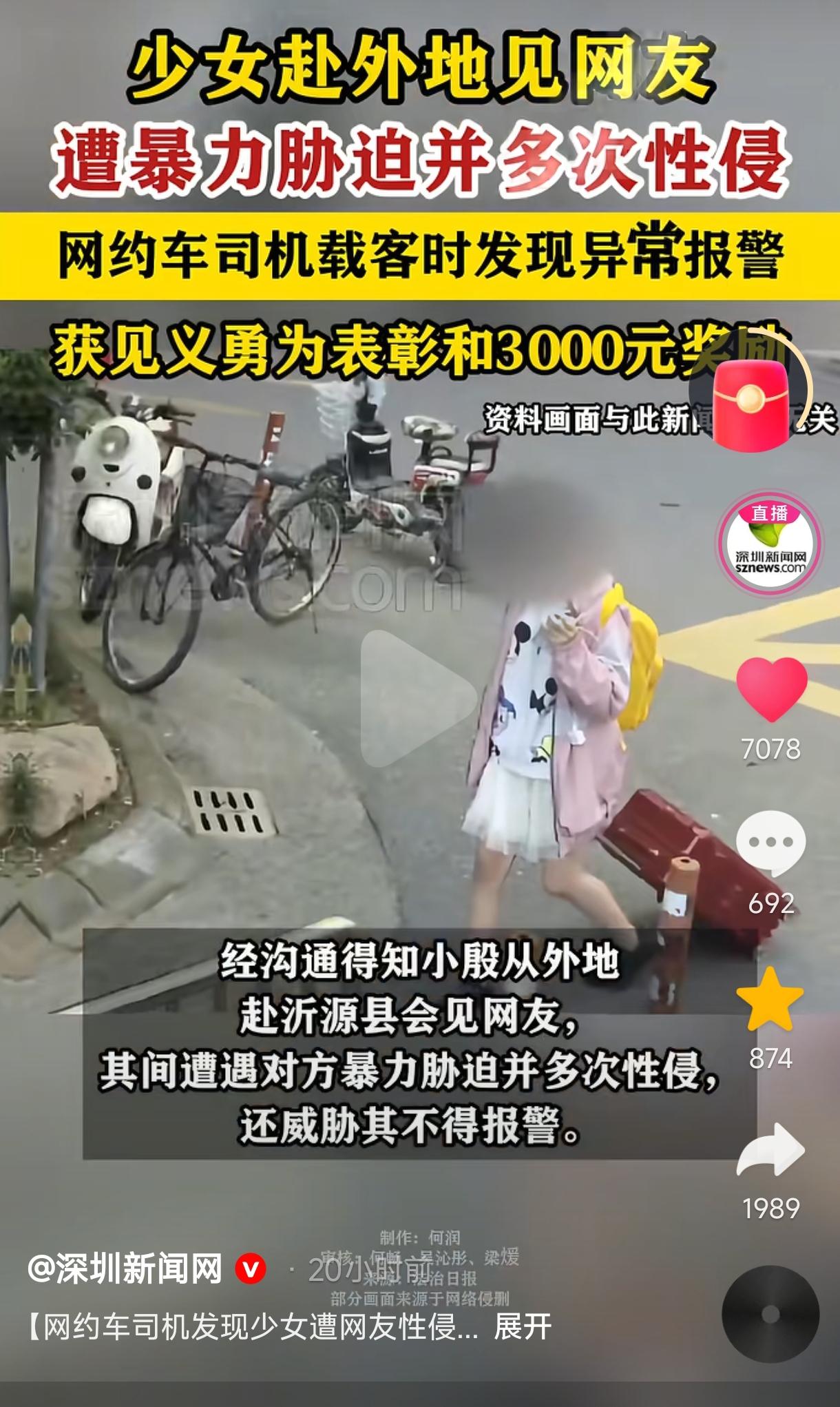 “警惕!”一名未成年女孩在网上聊了个男网友,对方热情邀请女孩到他在的城市游玩,单纯的女孩满怀期待去见男网友,却被对方多次性侵。后来女孩逃出来坐上了网约车,司机见女孩神情慌张,便询问其缘由,女孩绷不住说了实情,司机听后义愤填膺,他安抚好女孩情绪后,一路将女孩护送回了家,并同女孩父亲一同报了警,最终嫌犯被锁定,等待他的将是法律的严惩,而司机也因见义勇为获得了荣誉表彰与3000元奖励。 (来源:深圳新闻网) 2025年1月4日,山东沂源县,网约车司机苗师傅像往常一样出车,但这天他载到了一位奇怪的乘客-未成年女孩小殷。 小殷火急火燎地上了苗师傅的网约车,还紧张地观察身后的情况,貌似担心有人追上来她,上车后又催促苗师傅赶快开车。 苗师傅觉得不可思议,但还是启动了车,他从镜子里发现女孩貌似松了一口气,但脸上的情绪依然十分低落,好像遇到了什么难事。 苗师傅是一位热心肠的人,便试着询问小殷:“小姑娘,发生什么事了?有坏人在追你吗?” 小殷仍然心有余悸,对陌生人的询问依然十分警惕,她木然地摇摇头,不愿说出实情。 苗师傅见状,就温和地说:“别紧张,我不是坏人,你如果遇到了坏人,咱该报警就报警,绝不能让坏人逍遥法外!“ 苗师傅的话像一股暖流袭来,小殷终于绷不住了,眼泪哗哗的流,十分的伤心,而后她才抽泣着说了自己的遭遇。 原来,前段时间小殷在网上聊了一名男网友,对方十分健谈,幽默诙谐,两人越聊投机,之后男网友便热情地邀请小殷到他所在的城市游玩,带她逛名胜古迹,吃美食,等等。 听着对方的描述,单纯的小殷心生向往,便兴奋地背着父母买了火车票,千里迢迢、满怀期待地跨省去见心仪的男网友,没想到等待她的竟然是一场噩梦。 之后小殷如愿见到了男网友,对方却没有带他逛名胜、吃美食,而是将她软禁在卧室,多次暴力肋迫性侵小殷,还威胁她不得报警,令小殷痛苦不堪,悔恨不已。 为了逃脱男网友的魔爪,小殷开始表现得很听话,对方对她放松了戒备,小殷便偷偷收拾好行李。这天,趁男网友上厕所的空档时间,她赶紧用手机叫了一辆网约车,然后拎起行李就狂奔。 待上了网约车后,小殷这才松了一口气,但她慌乱的神情及低落的情绪还是被司机苗师傅看出了端倪,在苗师傅的热情询问之下,小殷这才说出了实情。 苗师傅一听,义愤填膺,小殷还是一位心思单纯的未成年女孩啊,却被男网友如此禽兽不如的对待,令热心肠的他忍不了一点,他一边安抚女孩,一边暗下决心要帮助这名可怜的女孩。 为了保护小女孩不再受到伤害,苗师傅干脆好人做到底,直接用网约车将女孩护送回了老家,那可是外省哦,可见苗师傅心地真是太善良了。 之后苗师傅向小殷的父母说明了小殷的遭遇,小殷父母听后也是气不打一处来,之后几个大人便一同报了警,苗师傅还提供了证言协助锁定了嫌犯,等待嫌烦的必定是法律的严惩。 根据我国《刑法》第236条规定,JY不满14周岁幼女的以强奸罪从重处罚,基础刑期3到10年,有加重情节处10年以上有期、无期或死刑。此案中男网友怎么判,还得依据具体情节而定。 但以聊天为由欺骗涉世未深的小女孩千里奔赴情节相当恶劣,应从重处罚,估计这名男网友恐10年刑期没跑了,但也要看具体裁定。 2025年12月30日,苗师傅因挺身而出保护受伤女孩,被授予见义勇为嘉奖以及3000元的现金奖励。 在同一座城市里,小女孩遇到了一好一坏两个人,这是人性善恶的鲜明对撞,撕开了网络虚拟世界的罪恶根源,也照亮了普通人挺身而出的正义之光,同时将未成年人保护、网络社交安全与社会正义守护等提上日程。 未成年女孩千里奔赴见网友,这是网络的虚拟感让她对陌生人产生了滤镜式信任,从而忽视了线下见面的人身安全隐患。而男网友以游玩为饵实施性侵并非临时起意,而是利用未成年人涉世未深对外界充满好奇而精心布置了罪恶圈套。 网约车司机的义举,是平凡人的正义担当,更是社会的良心兜底,他从发现异常,到主动询问,再到安抚情绪、送女孩回家,没有事不关己、高高挂起的冷漠,也没有被卷入麻烦的顾虑裹挟,而是用最朴素的善良,为陷入绝境的小女孩撑起了一片天,成为冬季里一束温暖的光。 嫌犯的行为显然已经构成了强奸罪,且被害人还是未成年,还多次侵犯,情节相当恶劣,依法当严惩,而无论其犯罪手段多么隐蔽,法律都不会放过他! 此案例中,小女孩的做法大为不妥,她居然相信了网络上陌生人的话,还背着父母千里奔赴去见对方,埋下了极大的安全隐患,最终还被男网友多次侵犯,成了人生中的一大噩梦。 警钟长鸣! 这件事给未成年人警醒:网络世界是虚幻的,千万不要尽信,有的不法分子就是利用未成年人的心思单纯与涉世未深进而行不法之举,一定要十分的警惕!