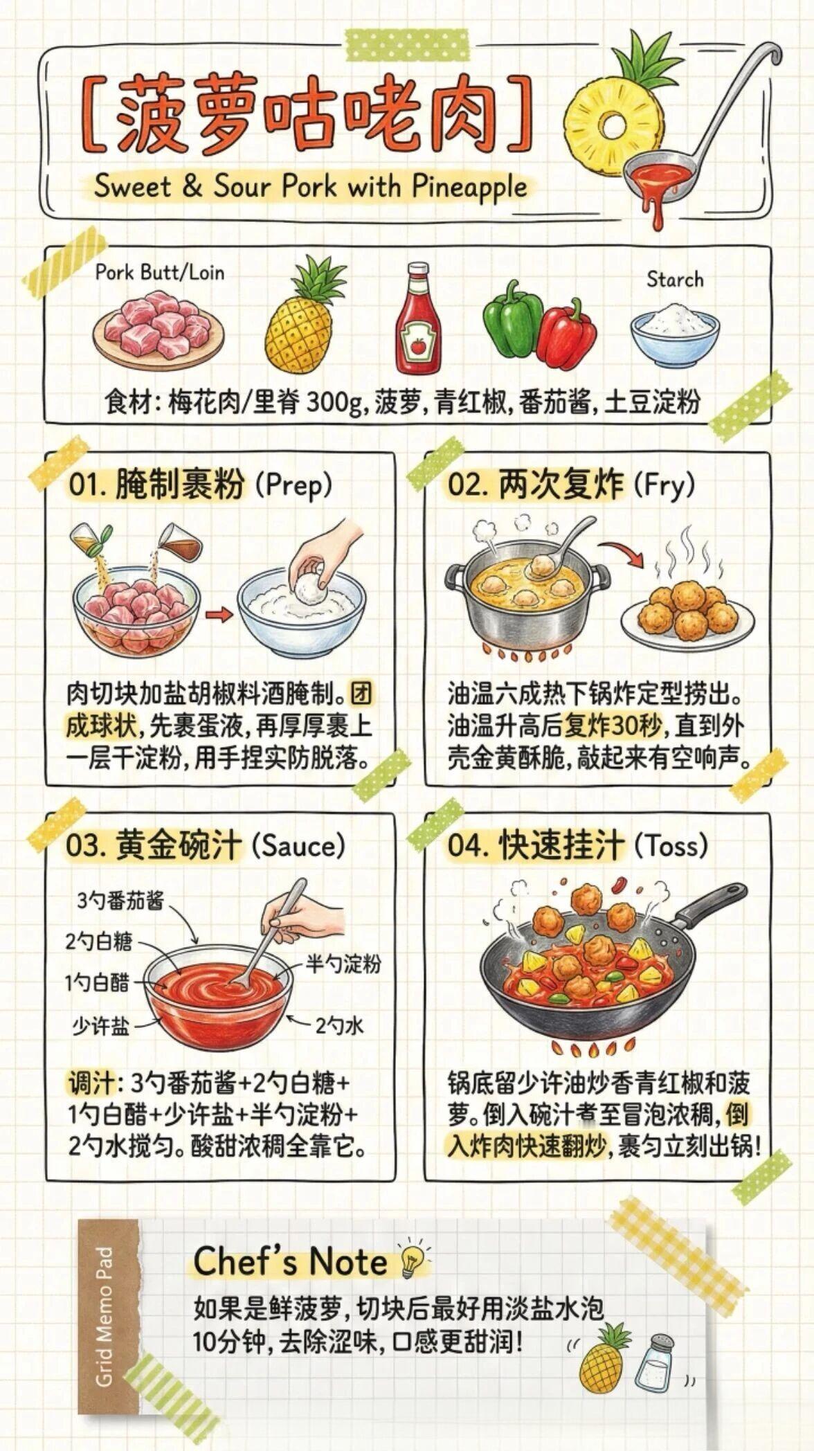 菠萝咕咾肉的酸甜口感,不管是配着米饭炫两碗,还是当开胃前菜,都超合适。关键做法一点不复杂,新手跟着步骤来,轻松就能拿捏外酥里嫩的口感~ 选肉和腌制是鲜嫩基础!优先挑猪里脊肉,肉质细嫩不柴,切成2厘米左右的方块刚好。加1勺料酒、少许盐和白胡椒粉,用手抓匀后静置10分钟,既能去腥味,还能让肉质提前入味,这一步可千万别偷懒! 挂糊是外壳酥脆的关键,记住这个小窍门:碗里放适量玉米淀粉,打1个蛋清,加少许清水搅拌成稠糊,稠度以能挂住肉、不滴落为准。把腌好的肉一块块裹匀糊,静置5分钟让糊充分贴合肉面,这样炸的时候才不会脱浆,外壳更脆。 炸肉两步走,外酥里嫩不翻车!起锅倒宽油,油温六成热(筷子插入冒小泡)时,把裹好糊的肉块下锅,炸至金黄定型后捞出控油。接着把油温升高到八成热,再把肉块倒进去复炸1分钟,捞出后外壳会更酥脆,咬着超有口感~ 炒汁掌握好比例,酸甜味超正!锅里留少许底油,放蒜末爆香,倒入调好的酱汁,开小火慢慢煮,边煮边搅拌,直到汤汁浓稠冒泡。这时放入切好的菠萝块,翻炒10秒让菠萝吸点酱汁,再倒入炸好的肉块,快速翻炒均匀,让每块肉都裹上满满的酱汁。最后可以淋少许水淀粉勾个薄芡,撒上一把葱花,立马出锅! 新手必看避坑指南:复炸时间别超1分钟,不然肉质会老得发柴;炒汁一定要用小火,火太大容易糊锅发苦;菠萝选成熟度适中的,去皮切块后用淡盐水泡5分钟,口感更甜还不涩,中和肉的油腻感也更到位。 简单几步,一道酸甜可口、外酥里嫩的菠萝咕咾肉就搞定了!平时在家做,大人小孩都爱吃。