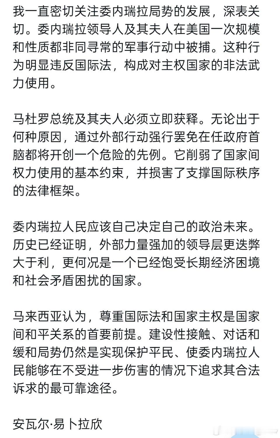 马来西亚总理安瓦尔:马杜罗总统及其夫人必须立即获释。无论出于何种原因,通过外部行动强行罢免在任政府首脑都将开创一个危险的先例。