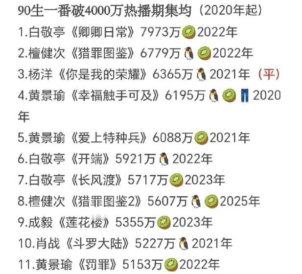 90生一番破5000万集均11部 从2020年云合脱水改版到现在,90生一番哟工有11部作品集均破5000万,其中白敬亭三部《卿卿日常》,《开端》和《长风渡》,黄景瑜三部《幸福触手可及》,《爱上特种兵》和《罚罪》,檀健次两部《猎罪图鉴》和《猎罪图鉴2》,其余三位是杨洋《你是我的荣耀》,成毅《莲花楼》,肖战《斗罗大陆》。