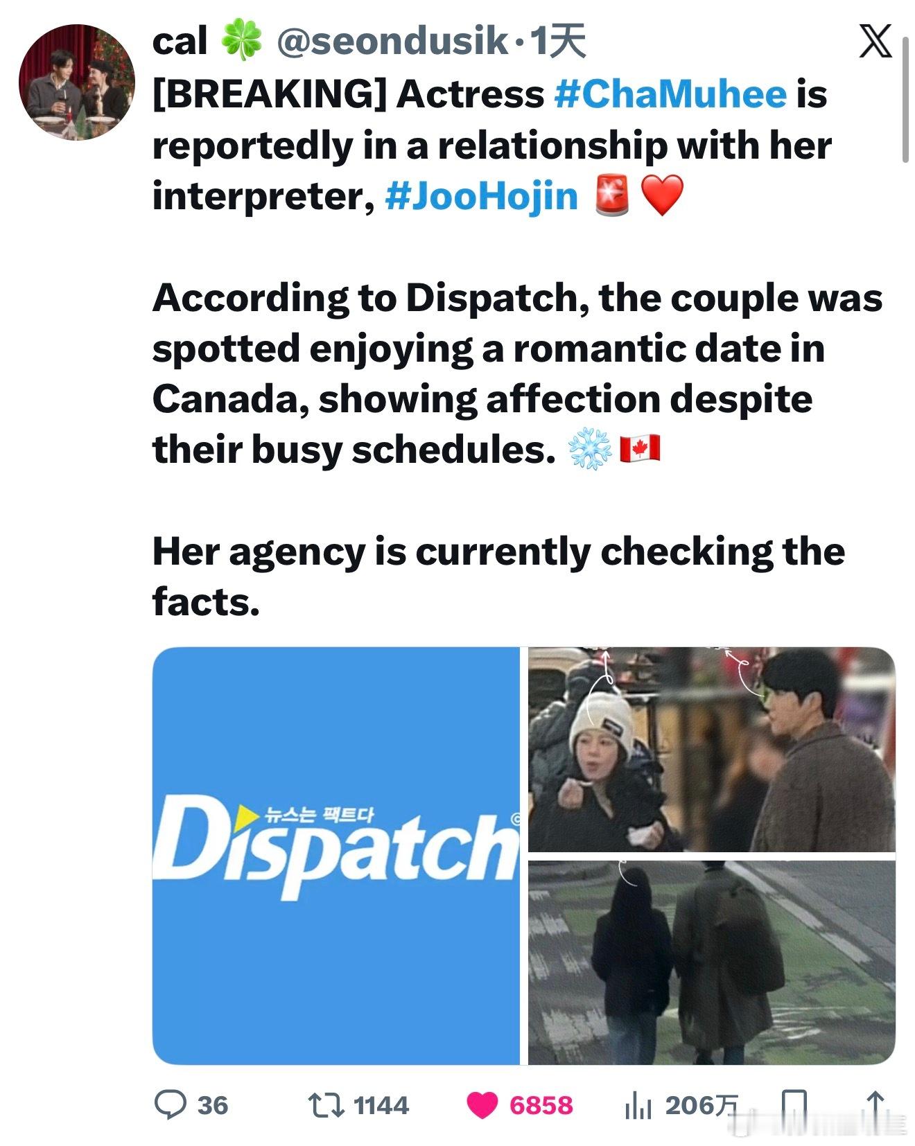【热推】玩D社爆料恋情梗~(feat这爱情可以翻译吗)【突发】 据传演员车武熙正在与她的翻译朱浩镇交往 🚨❤️据Dispatch报道,这对情侣被拍到在加拿大甜蜜约会,即使行程繁忙也难掩爱意❄️🇨🇦目前她的经纪公司正在核实情况。