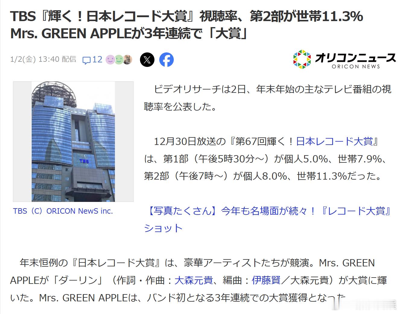 12月30日播出的第67届《日本唱片大奖》中,第1部的个人收视率为5.0%、家庭
