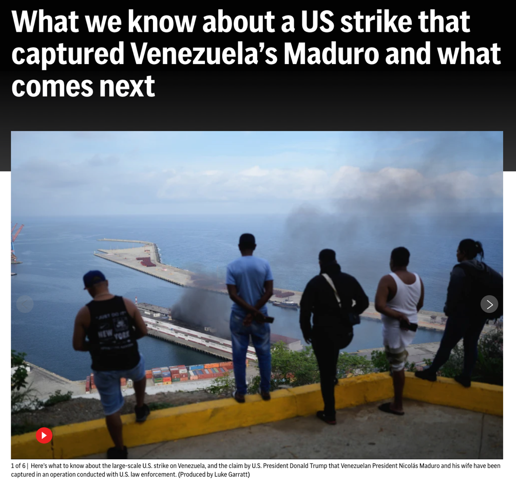 美联社报道,美国发动闪电军事打击抓获马杜罗及妻子,并将他们押送美国接受审判。