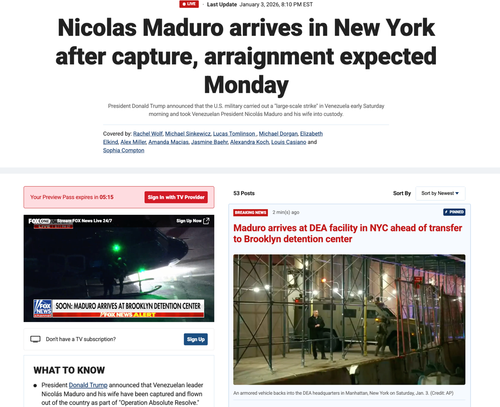 福克斯报道,马杜罗已被押至纽约,预计周一接受传讯。