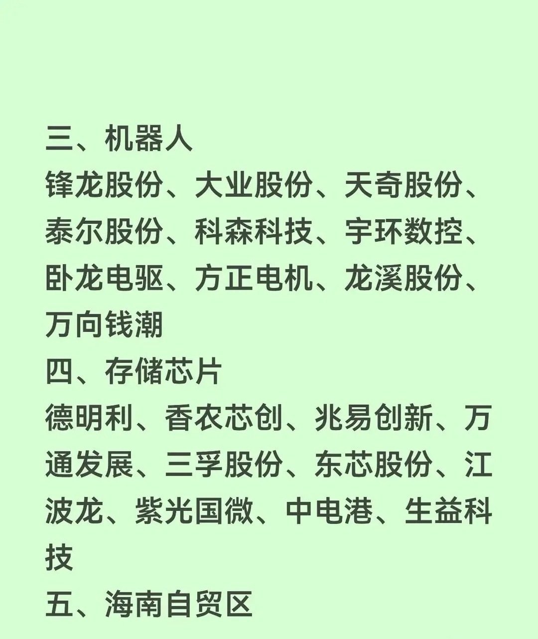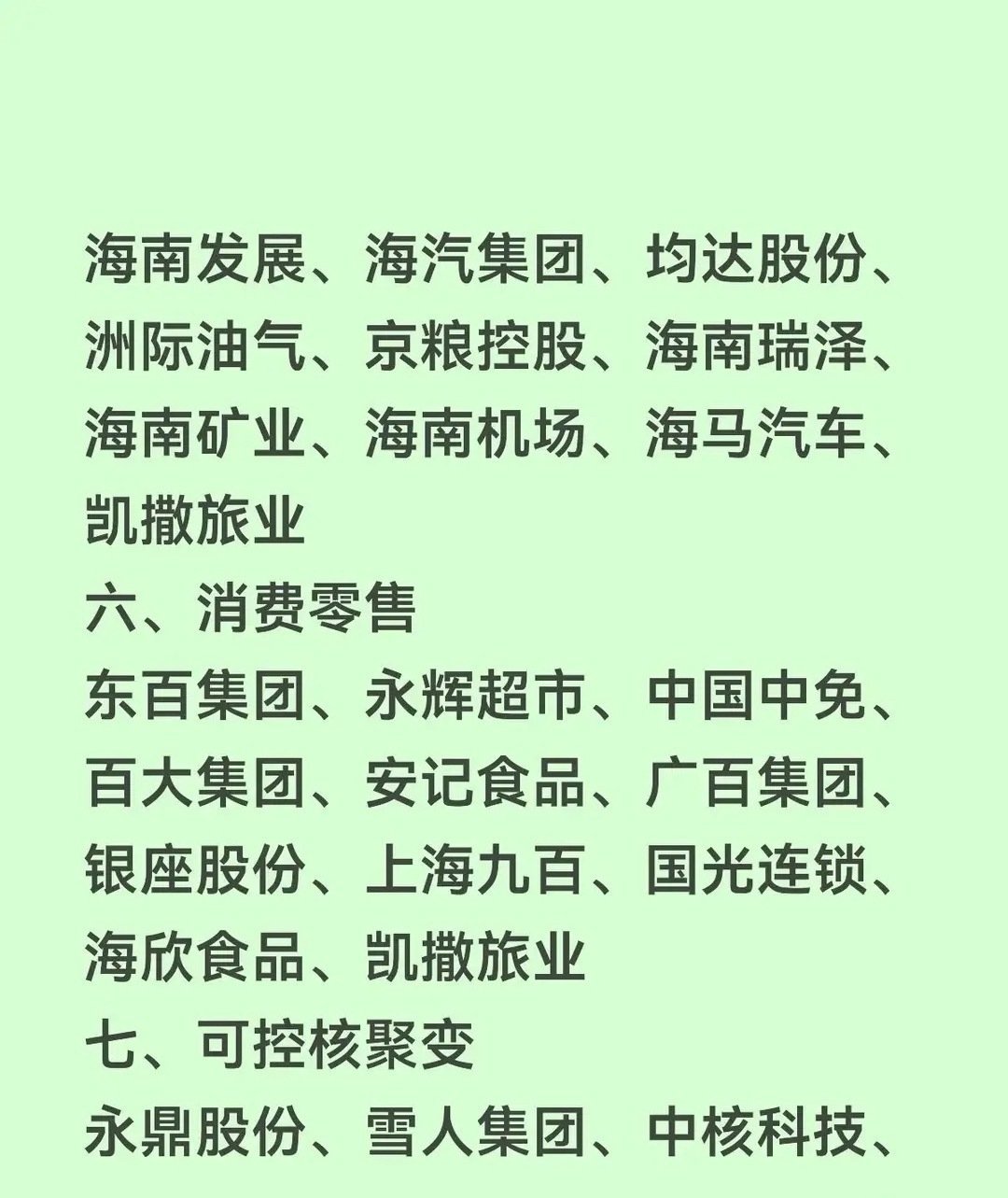“2026产业元年,八大主线” 相关的行业和代表公司,旨在为投资或研究提供参考,并建议收藏。整体以浅绿色背景、黑色文字分条列出,结构清晰。八大主线及对应主要公司/概念:1. 商业航天 - 代表公司:航天发展、航天动力、神剑股份、通宇通讯、中超控股、西测测试、中国卫星、大业股份、中国卫通、航天电子 - (其中“航天发展”“航天动力”被特别标注)2. 固态电池 - 代表公司:天际股份、恩捷股份、丰元股份、恒大高新、多氟多、天赐材料、永兴材料、天齐锂业、赣锋锂业、永太科技3. 机器人 - 代表公司:锋龙股份、大业股份、天奇股份、泰尔股份、科森科技、宇环数控、卧龙电驱、方正电机、龙溪股份、万向钱潮4. 存储芯片 - 代表公司:德明利、香农芯创、兆易创新、万通发展、三孚股份、东芯股份、江波龙、紫光国微、中电港、生益科技5. 海南自贸区 - 提及板块,但图片中未列出具体公司名单(后续在第 3 张图中补充了海南相关企业)。6. 消费零售 - 代表公司:东百集团、永辉超市、中国中免、百大集团、安记食品、广百集团、银座股份、上海九百、国光连锁、海欣食品、凯撒旅业7. 可控核聚变 - 代表公司:永鼎股份、雪人集团、中核科技8. 光伏 - 代表公司:上海港湾、协鑫集成、均达股份、亿晶光电、东方日升、金风科技、隆基绿能、合盛硅业、特变电工、赛伍技术结论:这八大主线覆盖了航天、新能源(固态电池、光伏)、高端制造(机器人、存储芯片)、区域经济(海南自贸区)、消费、前沿能源(可控核聚变)等热点产业,适合作为 2026 年产业趋势与投资机会的参考清单。