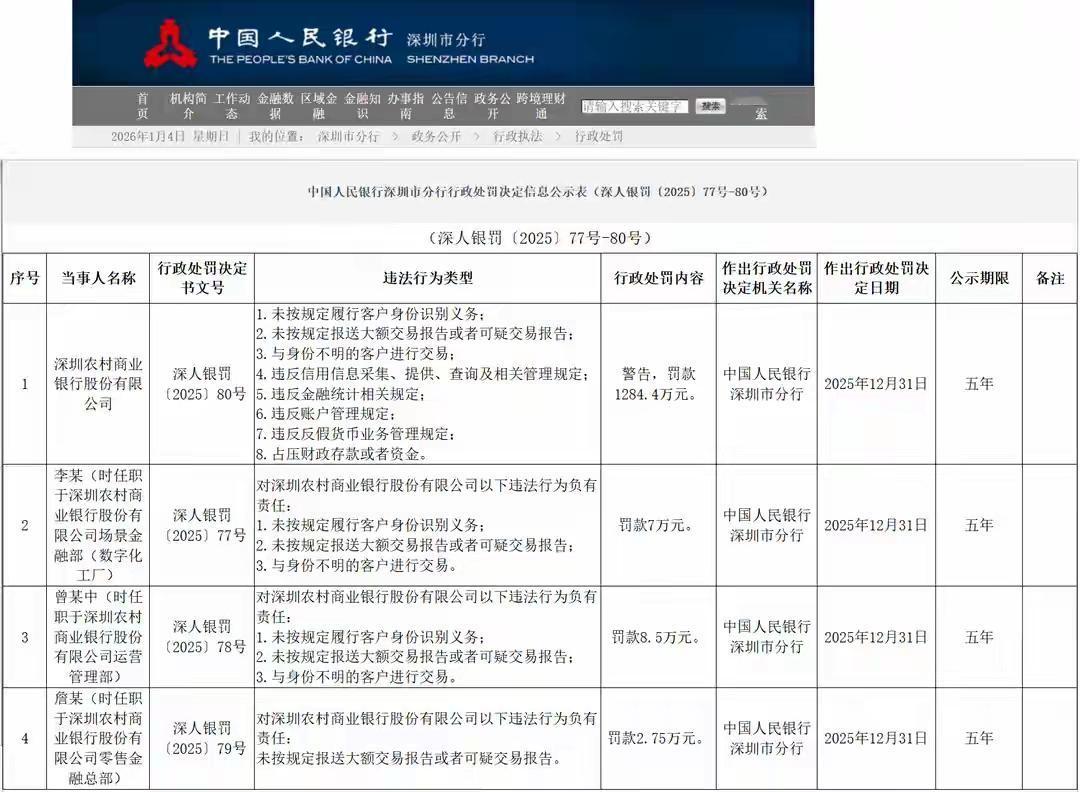 深圳农商行栽大跟头!8宗罪齐犯,千万罚单暴击还连带3人追责! 刚刷到央行重磅罚单,深圳农商行这次彻底栽了,直接被央行深圳市分行罚1284.4万外加警告,3名内部责任人也没跑掉,合计被罚18.25万,处罚文号深人银罚〔2025〕80号,证据确凿没得跑。 这银行也是心大,8条金融合规红线直接踩了个遍,简直像在监管雷区蹦迪。不仅不核实客户身份、不报大额可疑交易,还敢跟身份不明的人做生意,信用信息、金融统计、账户管理全乱套,反假货币业务瞎搞,甚至敢占压财政存款,风控漏洞大得能跑火车。 被追责的3人分工明确,场景金融部李某罚7万,运营管理部曾某中罚8.5万,零售金融总部詹某罚2.75万,精准问责到人。 全程按《反洗钱法》等法规处罚,一点不手软。这事儿也给所有金融机构敲了警钟,合规底线碰不得,不然迟早吃大亏!
