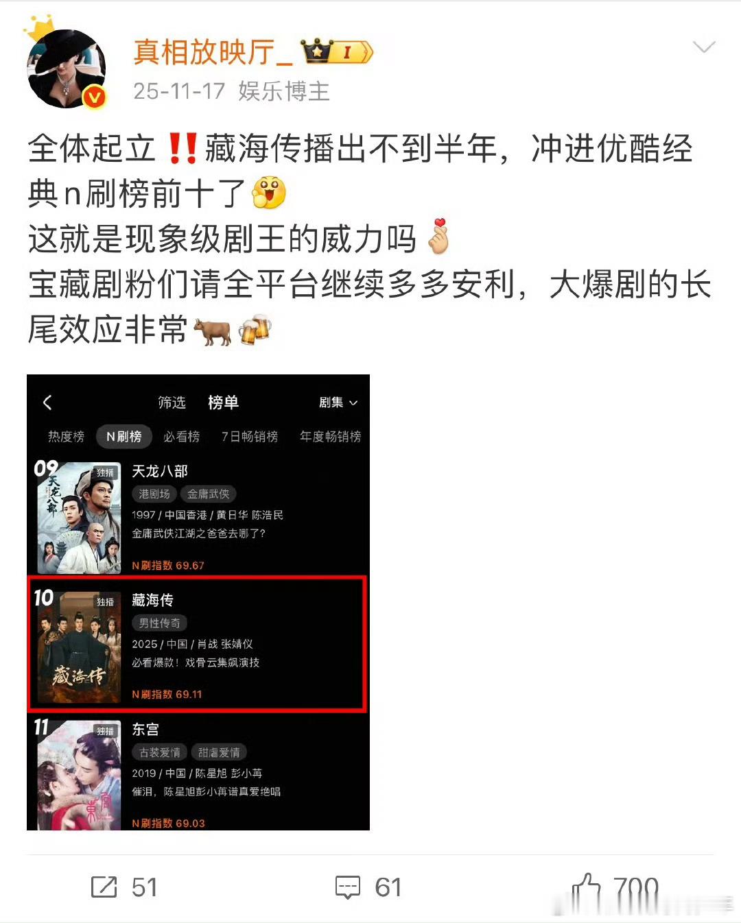 藏海传播出不到半年就登上优酷经典N刷榜了五年来唯一一部就是这部肖战主演的藏海传 !粉圈拉假表可别把自己都骗了