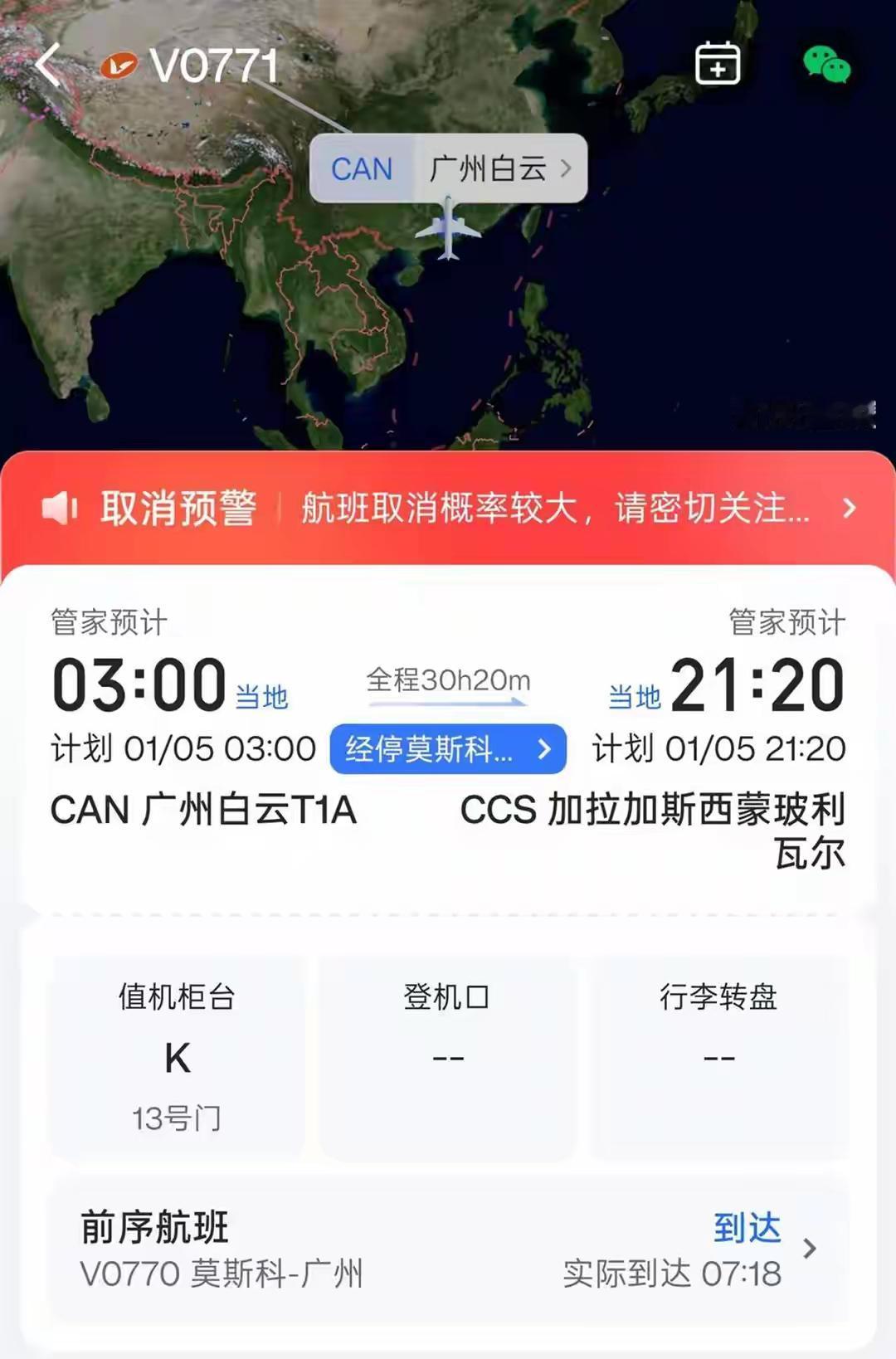 中国唯一直飞委内瑞拉的航班取消了,这事儿挺闹心。1月3日下午,委内瑞拉康维亚萨航空发通知,因不可抗力,原计划1月5日3点从广州飞加拉加斯的V0771航班取消。这航班全程约30小时,还得经停莫斯科。 航司中国区客服称,是国际形势不稳定,出于安全考虑才取消,会给乘客办全额退票或改签。要是只买了广州到莫斯科段不受影响,莫斯科到加拉加斯就没了,客机空机返委。目前从委回中国1月16日航班显示正常,但大家还得时刻盯着消息。在委华人想回国,要不先去周边国家转机,要不就等直飞。