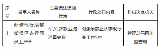 相关贷款业务严重失职,邮储银行成都武侯区支行一员工被禁业5年