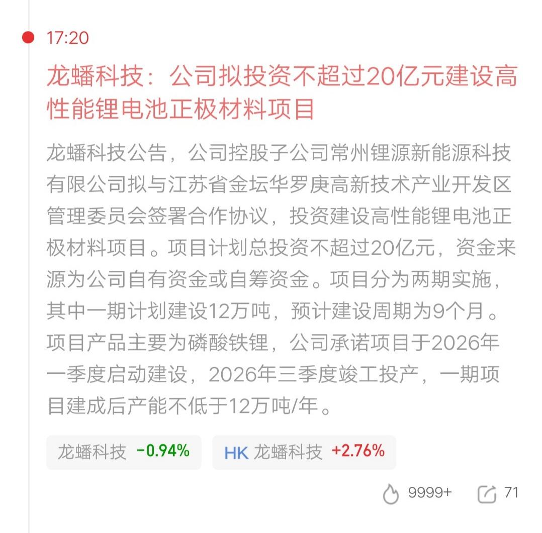 运气来了挡都挡不住呀 8.58万散户大概率要吃肉了 真让人羡慕嫉妒恨呀 龙蟠科技:公司拟投资不超过20亿元建设高性能锂电池正极材料项目。 这可是实实在在的利好呀 砸钱建厂扩大产能,说明看好行业未来前景 市场目前两极分化 有利好的板块涨到起飞 没利好的板块趴着不动 大家说是不是这个理