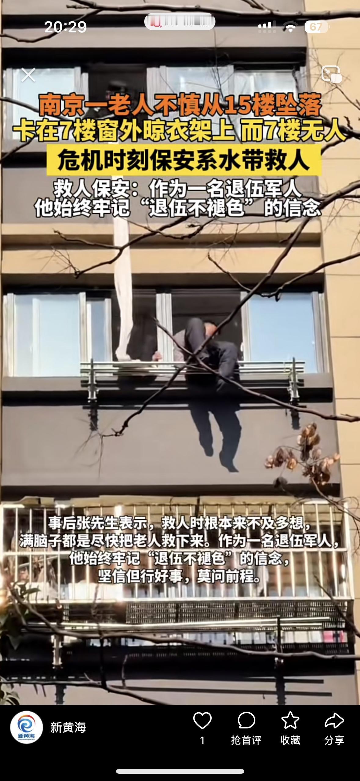 太吓人了!大爷福大命大!看来保安年轻化非常有必要,如果不是这位保安,大爷早就没命了 大爷从15楼掉到7楼的晾衣架上,整个人半身悬在空中,稍微一动估计就没命了!还好保安队长用消防水带当绳索爬楼和业主一起把老人救了下来 大爷也是福大命大,不然早就掉下去了!根本撑不了多久