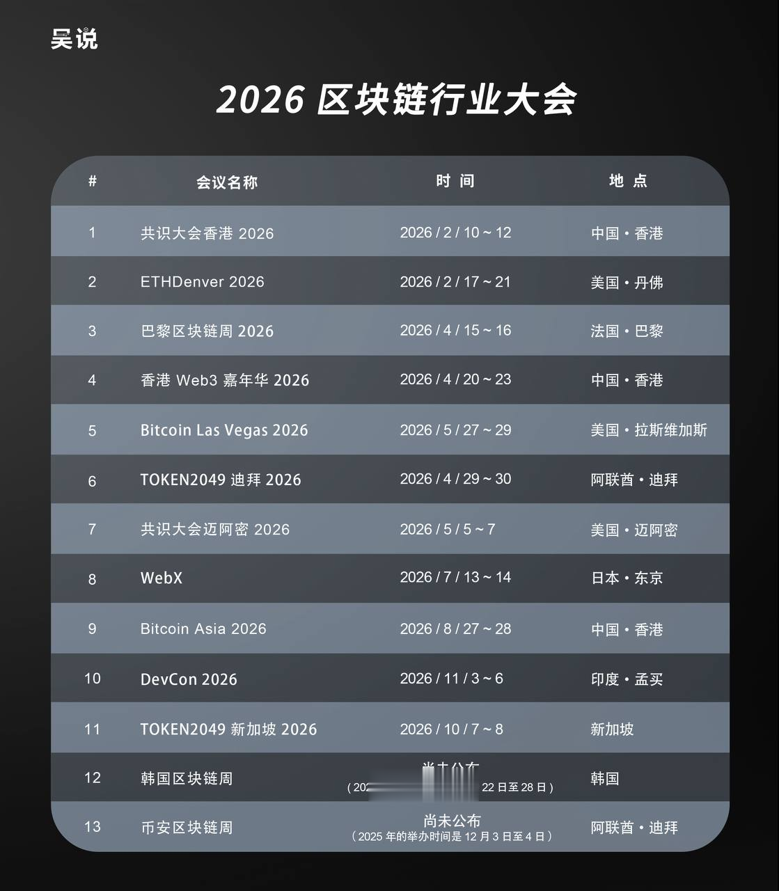吴说团队总结的2026年13个大规模加密货币会议,包括香港共识大会、ETHDenver、巴黎区块链周、Token2049、比特币2026、韩国区块链周、日本WEBX等。