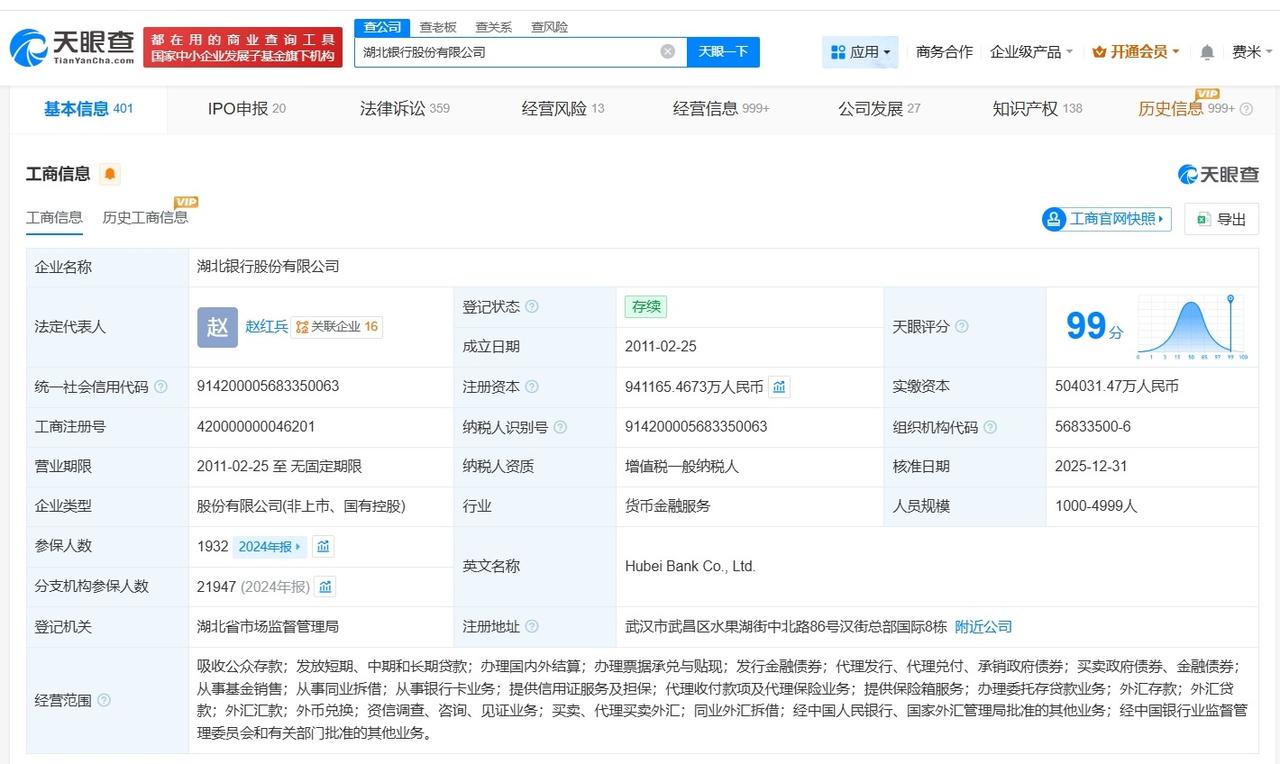 湖北银行增资至94.1亿增幅约24% 天眼查App显示,近日,湖北银行股份有限公司发生工商变更,注册资本由约76.1亿人民币增至约94.1亿人民币,增幅约24%。 湖北银行股份有限公司成立于2011年2月,法定代表人为赵红兵,经营范围包括吸收公众存款、办理国内外结算、办理票据承兑与贴现等。股东信息显示,该公司由湖北宏泰集团有限公司、湖北交通投资集团有限公司、长江产业投资集团有限公司等共同持股。 天眼查信息: