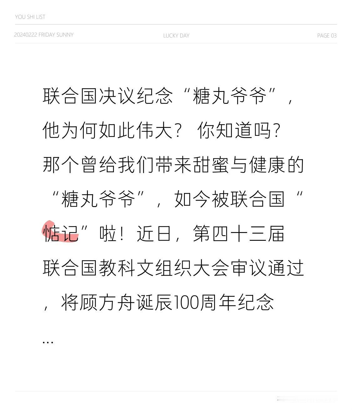 联合国决议纪念“糖丸爷爷”,他为何如此伟大? 你知道吗?那个曾给我们带来甜蜜与健康的“糖丸爷爷”,如今被联合国“惦记”啦!近日,第四十三届联合国教科文组织大会审议通过,将顾方舟诞辰100周年纪念活动纳入联合国教科文组织系列纪念活动。 “糖丸爷爷”顾方舟,一生都在与脊髓灰质炎作斗争。1957年,他主动请缨,带领团队研发脊髓灰质炎疫苗。为了验证疫苗安全性,他先是自己带头喝下疫苗溶液,后又让未满周岁的儿子参与临床试验。这份勇气和担当,令人动容。 他还将液体疫苗改良成糖丸疫苗。甜甜的糖丸,让孩子们不再抗拒接种,也解决了疫苗储存运输的难题,使得脊髓灰质炎年平均发病率逐年下降。1994年后,我国再未发现由本土病毒引起的病例,2000年,中国正式成为消灭“脊灰”的国家。 顾方舟深知脊髓灰质炎是全球性难题,他积极分享中国经验,其主导制定的规程成为国际通用规范,糖丸疫苗也在全球广泛应用,护佑了亿万儿童的“脊梁”。 联合国纪念“糖丸爷爷”,不仅是对他个人成就的认可,更是让他的科学精神与家国情怀成为人类共同的精神财富。 你还记得小时候吃的糖丸吗?对于“糖丸爷爷”,你有什么想说的?快来评论区分享吧。