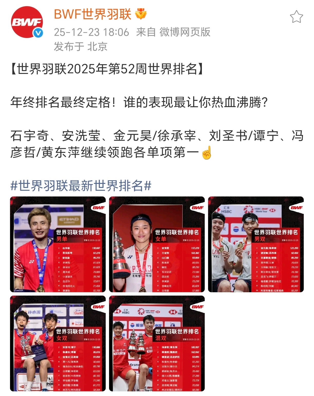 作为羽毛球唯一官方杂志,这个数据都能写错吗?不审核、不校对的吗?截止2025年12月23日,混双年终世界排名第一的是中国队的冯彦哲和黄东萍,总积分105957。 不应该对被写错积分的运动员道歉吗?作为消费者订购两本,买到错误数据,你们官方的补救措施是什么?