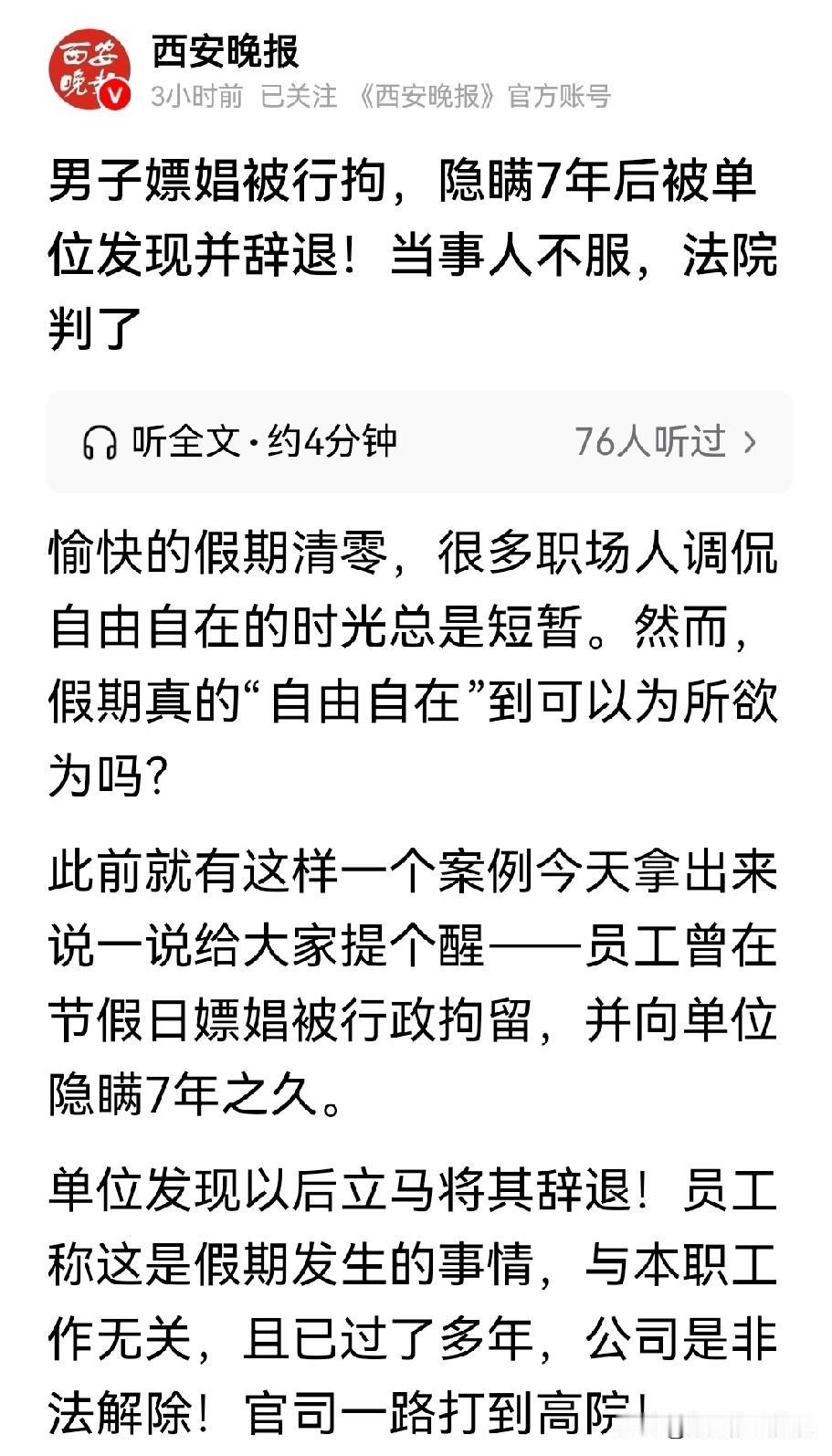 山东济宁,一银行男员工在7年前,单位放假期间,曾因嫖 娼被行政拘留并罚款处理,但他一直刻意隐瞒不报。7年后,被单位发现,单位以该员工违反单位规章制度为由,立马将其辞退,员工不服,申请劳动仲裁,仲裁委裁决:事情发生后7年,再处理无合理理由,双方应继续履行劳动合同。银行不服,提起诉讼,一审、二审银行胜诉,员工又不服, 官司一路打到高院,最终结局,大快人心! 周某是某银行的员工,他在2005年,就和单位签订了无固定期限的劳动合同。 合同中明确规定了,员工如果违反单位的规章制度,单位有权解除劳动合同。 银行为此专门组织员工进行了学习。 周某对单位的规章制度十分了解,但他不但不遵守,还故意做了违法的事。 2011年9月,单位放假期间,周某一时没有把持住自己,在某场所嫖 娼期间被警方抓获。 被处以行政拘留10日,罚款5000元的行政处罚。 事后,周某该上班的上班,并未将此事告知单位,刻意将此事悄悄隐瞒了。 这件事情过去了好多年,周某曾一度觉得自己的瞒天过海很成功。 这件事差不多连他自己都快忘了,可就在2017年,事情最终还是败露了! 他所在的单位查出了周某的违法事实。 单位对于这类违法事实,采取0容忍的态度。 因周某的违法行为,违反了单位的规章制度,银行决定立马将周某辞退。 单位就周某被辞退征求了工会意见,工会建议,银行单方面解除劳动合同。 最终,周某被单位辞退,并和他解除了劳动合同,周某被辞退后,十分不服。 他认为,自己的违法行为已经过去了7年,而且当时是在假期,和本职工作无关,单位凭什么辞退自己? 周某向劳动仲裁部门申请了仲裁。 仲裁委以银行在周某违规违纪已经过去了7年后,才作出处理无合理理由,裁决双方,继续履行劳动合同。 也就是说,事情已经过去了7年,现在处理已经过了时效, 银行的辞退无效,周某仍可以回银行上班。 就在周某沾沾自喜,以为自己已经过关时,银行对仲裁结果不认可,向法院提起了诉讼。 法庭上,银行一方称:单位制定的《员工违规处理办法》符合法律规定。 而且,周某的嫖 娼行为被警方处罚,明显违反了单位的规章制度,且该行为应属于严重的情形。 之所以7年后才对周某作出辞退处理,并非银行的过错,而是因为周某隐瞒不报。 另外,对周某解除劳动合同,是征求过工会意见的,程序上合法合规。 一审,法院经审理后判决,银行对周某辞退合法有效,双方劳动合同于2017年11月9日解除。 对一审判决,周某不服,他提起了上诉。 结果二审法院驳回了周某的上诉,维持了原判。 周某仍不服气,随后向高院申请了再审。 周某这次做了充足的准备。 他提出,当年做下此事的时候,是放假期间,危害较小。 且违法事实与自己的工作关系无关,不应算是违反单位的规章规范。 因此,银行无权对员工作出辞退处理,而且银行对其辞退,程序上严重违法。 周某的理由,可谓是无理搅三分,自己做出的不轨行为,不但不反思,却还怨单位辞退他。 自己也不想想,哪个单位愿用这样的人? 高院经过审理认为,周某的行为,既违反了《治安管理处罚法》,也严重的违反了用人单位的规章制度。 当初双方签订的劳动合同条款中,明确约定了员工发生此类情形,可随时解除劳动合同。 用人单位之所以在7年后才对周某作出处理,完全是由于周某刻意隐瞒了自己的违法事实。 用人单位在发现后,对周某作出处理,完全合法。 银行无义务参照民事诉讼时效,和行政处罚期限的规定。 根据《劳动合同法》第39条:劳动者有下列情形之一的,用人单位可以解除劳动合同:(一)在试用期间被证明不符合录用条件的; (二)严重违反用人单位的规章制度的; (六)被依法追究刑事责任的。 该条款,赋予了用人单位一定的管理自主权。 银行与周某签订的劳动合同中,明确规定员工违反单位规章制度,单位有权解除劳动合同。 周某因嫖 娼行为,违反了银行《员工违规处理办法》,该办法经民主程序制定,且已公示告知,符合法律规定,可作为审理依据。 所以,银行辞退周某是有法律依据的,维护了单位正常的管理秩序,也让员工明白需对自己违反规章制度的行为负责。 《治安管理处罚法》第66条第1款:卖y、p娼的,处10日以上15日以下拘留,可以并处5000元以下罚款; 情节较轻的,处5日以下拘留或者500元以下罚款。 该条款明确了p娼行为是违违治安管理的行为,且规定了相应的处罚措施。 这是法律对社会公序良俗的维护,提醒人们要遵守基本的道德和法律规范。 本案中,周某因p娼被处以行政拘留10日、罚款5000元,就是依据上述条款。 也就是说,即使是在假期,个人行为也不能触犯法律红线,否则将承担法律后果。 因此,周某被单位辞退一点也不冤。 最终,高院驳回了周某的再审申请。 对此,你怎么看?